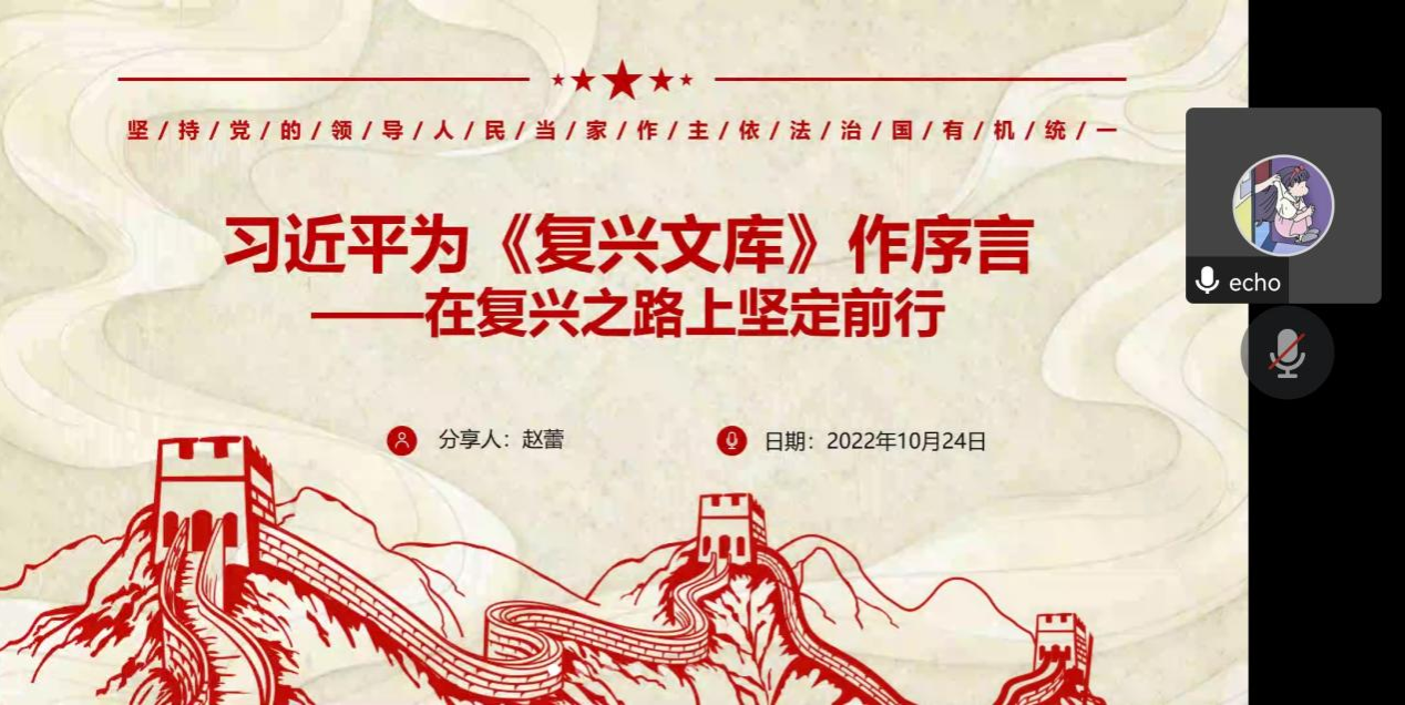 会上,周韦玮同志介绍了中央全面深化改革委员会第二十七次会议的会议内容,勉励大家要脚踏实地、埋头苦干、锐意进取,时刻保持中国共产党员的使命感,始终发扬“咬定青山不放松”的斗争精神,努力成为堪当民族复兴重任的时代新人,让青春在为祖国、为民族、为人民的不懈奋斗中绽放光芒。随后,丛清莹同志介绍了“奋进新时代”主题成就展,学习贯彻习近平总书记参观“奋进新时代”主题成就展重要讲话精神。告诉我们要在实践中去理解、去推动、去凝聚共识,最终落实在⾏动上。广大党员干部要学懂弄通主题成就展背后的精神力量,从中汲取力量之源,赓续奋斗的强劲动力,努力创造无愧于党、无愧于人民、无愧于时代的优秀业绩,向“党的二十大”献礼。赵蕾同志全面而深刻地介绍了习近平总书记为《复兴文库》所作,题为《在复兴之路上坚定前行》的序言。首先,从性质、种类、背景、目的及意义等方面概括介绍了《复兴文库》一书,其次,提出该篇序言思想深邃、内涵丰富,是一篇闪耀着马克思主义思想光辉的纲领性文献,引领全党全国人民坚定历史自信、把握时代大势、走好中国道路,以中国式现代化推进中华民族伟大复兴。最后,周慧媛同志主要分享了习近平总书记在《求是》杂志发表的重要文章《坚持和发展中国特色社会主义要一以贯之》。该文章强调了新时代中国特色社会主义是我们党领导人民进行伟大社会革命的成果,也是我们党领导人民进行伟大社会革命的继续,必须要一以贯之进行下去,主要从五个方面进行讲解,分别为“中国特色社会主义是宝贵成果”、“高举中国特色社会主义伟大旗帜”、“旗帜决定方向”、“道路决定命运”、“不忘初心、牢记使命,将伟大的社会主义革命继续推进下去”。
