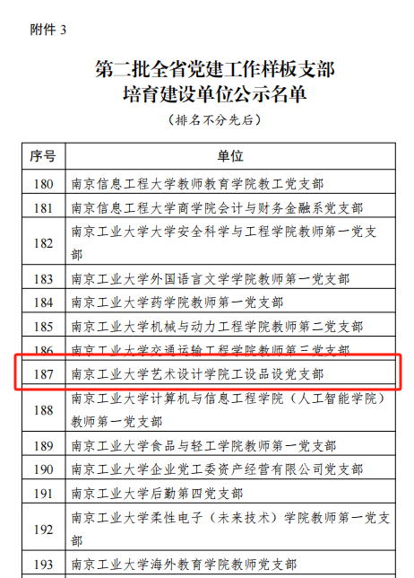 近日,省委教育工委公布了新时代江苏高校三级党组织“强基创优”建设计划第二批遴选结果的公示名单,太阳集团tcy8722工设品设党支部成功入选全省党建工作样板支部培育建设单位。