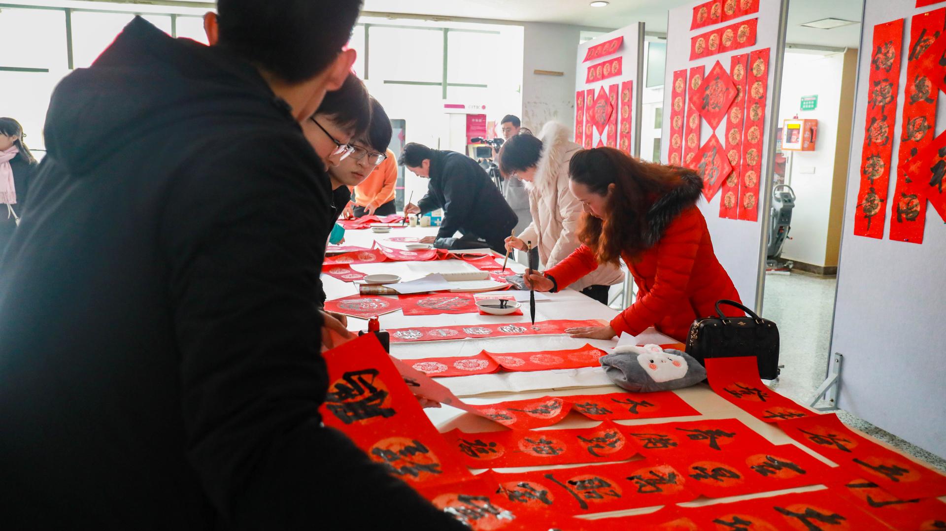 “笔墨浓情传祝福”送春联活动在《春节序曲》中拉开序幕。党委宣传部杨芳,离退休工作处蒋留兆,档案馆钱婷,马克思主义公司陶然,太阳集团tcy8722王志强、付强、冯梓月,交通运输工程公司袁国林,外国语言文学公司江娇等书法名师及书法爱好者现场挥毫,根据在场师生喜好定制专属春联。“天增岁月人增寿,春满乾坤福满门”寄托了师生间真挚的新年祝福;“虎啸风生远,龙腾海浪高”表达了师生对虎年更进一步的殷切期盼。活动现场来往写春联、请春联师生络绎不绝,墨香四溢,喜气洋洋。