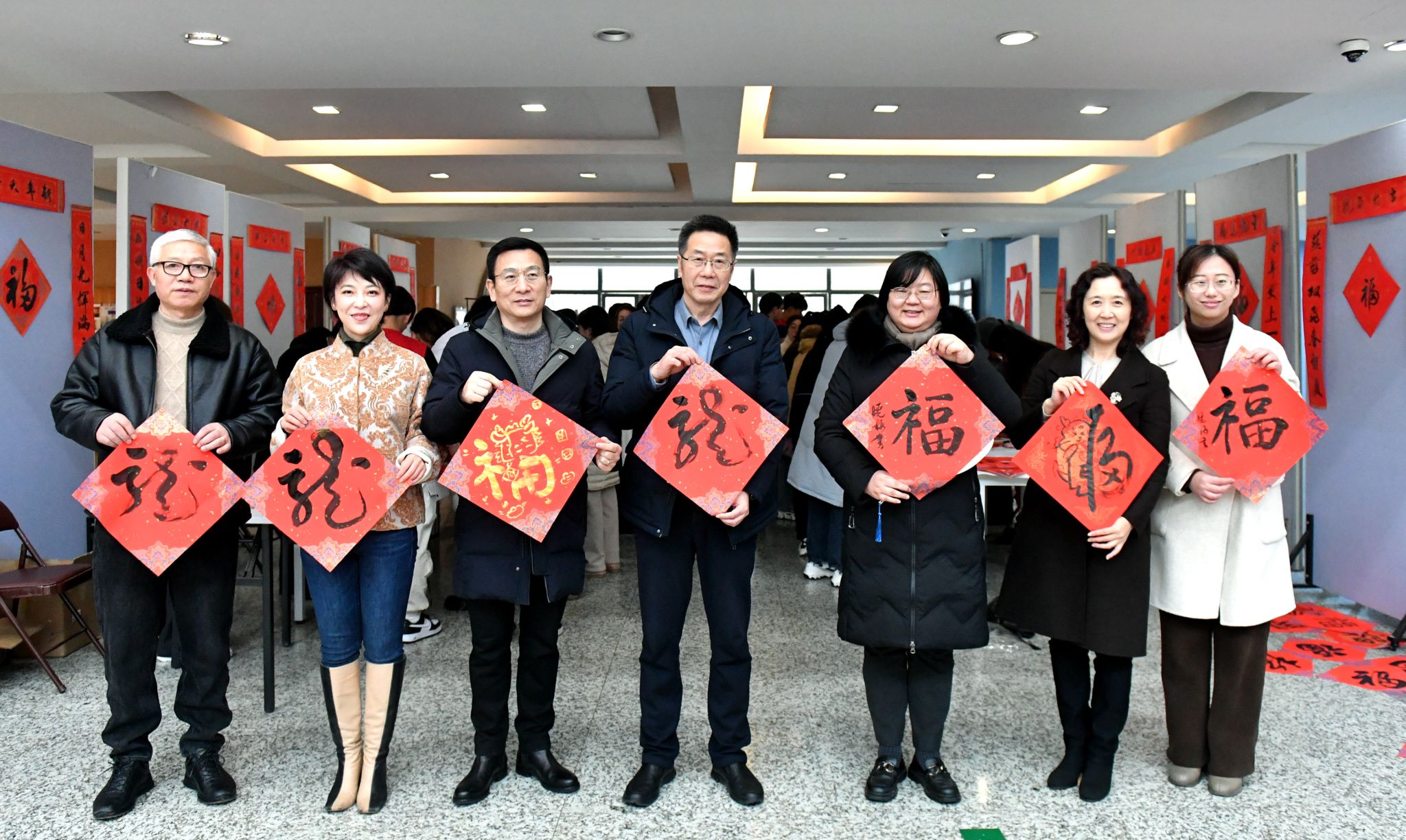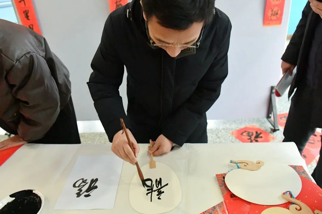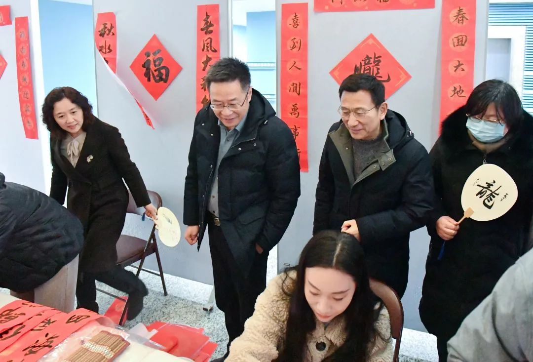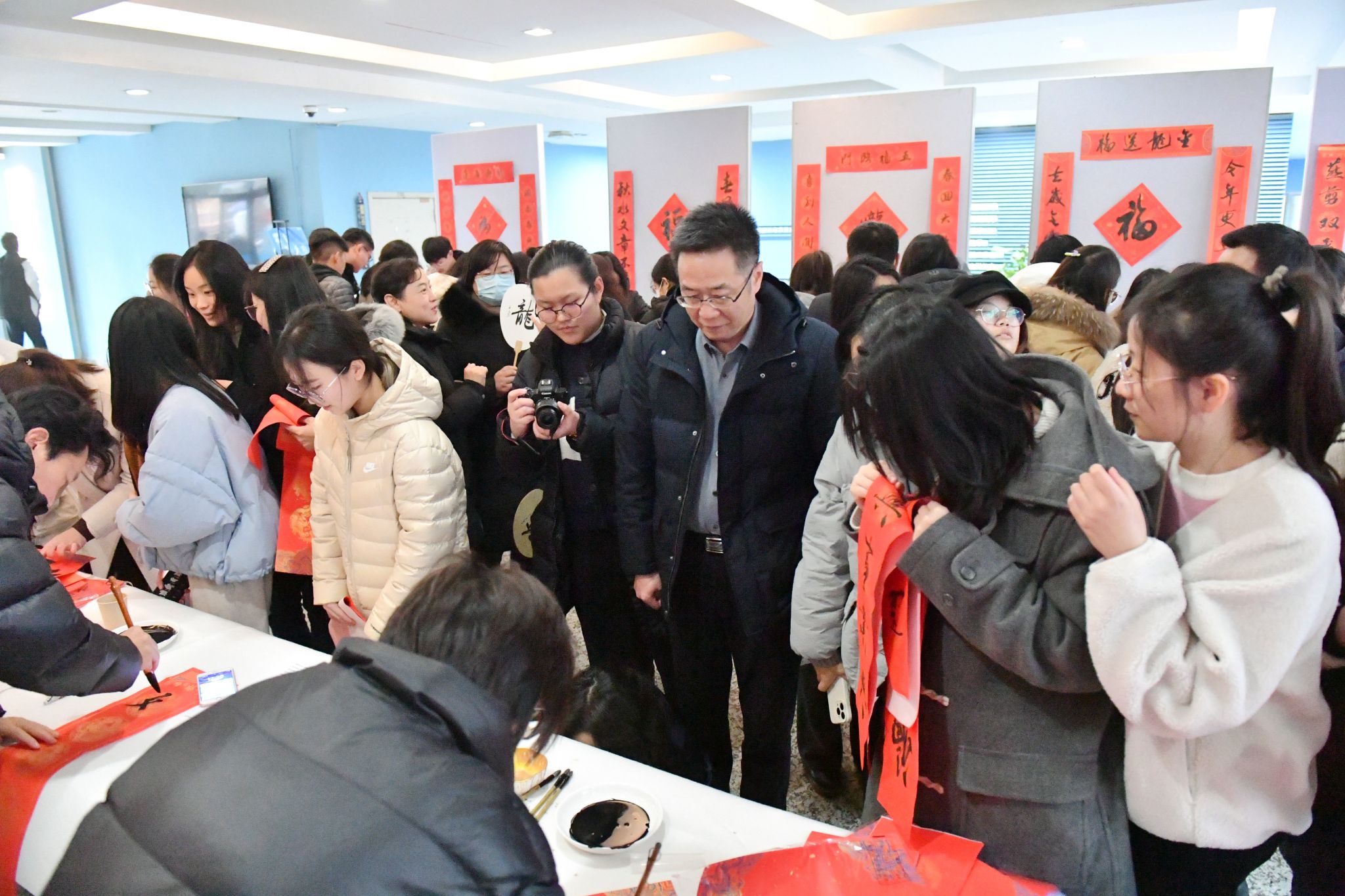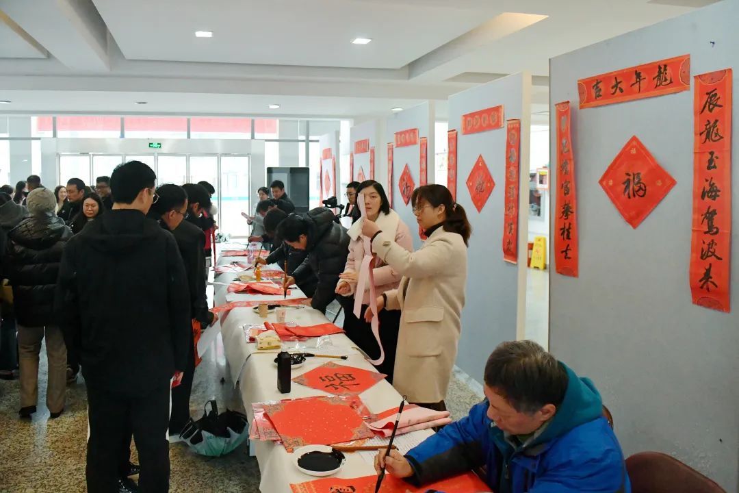 为深入学习贯彻党的二十大精神,进一步弘扬中华优秀传统文化,1月18日中国传统节日腊八节之际,由校工会、太阳集团tcy8722、建筑公司联合主办,校教职工书画协会承办的“翰墨飘香写福字,迎春送福暖人心”2024迎春送福活动在博学楼一楼中庭举行。副董事长郭万牛,党委常委、党委宣传部部长夏侃,相关职能部门负责人,师生代表现场观看,感受饱含真情的祝福,欣赏各具风格的春联。