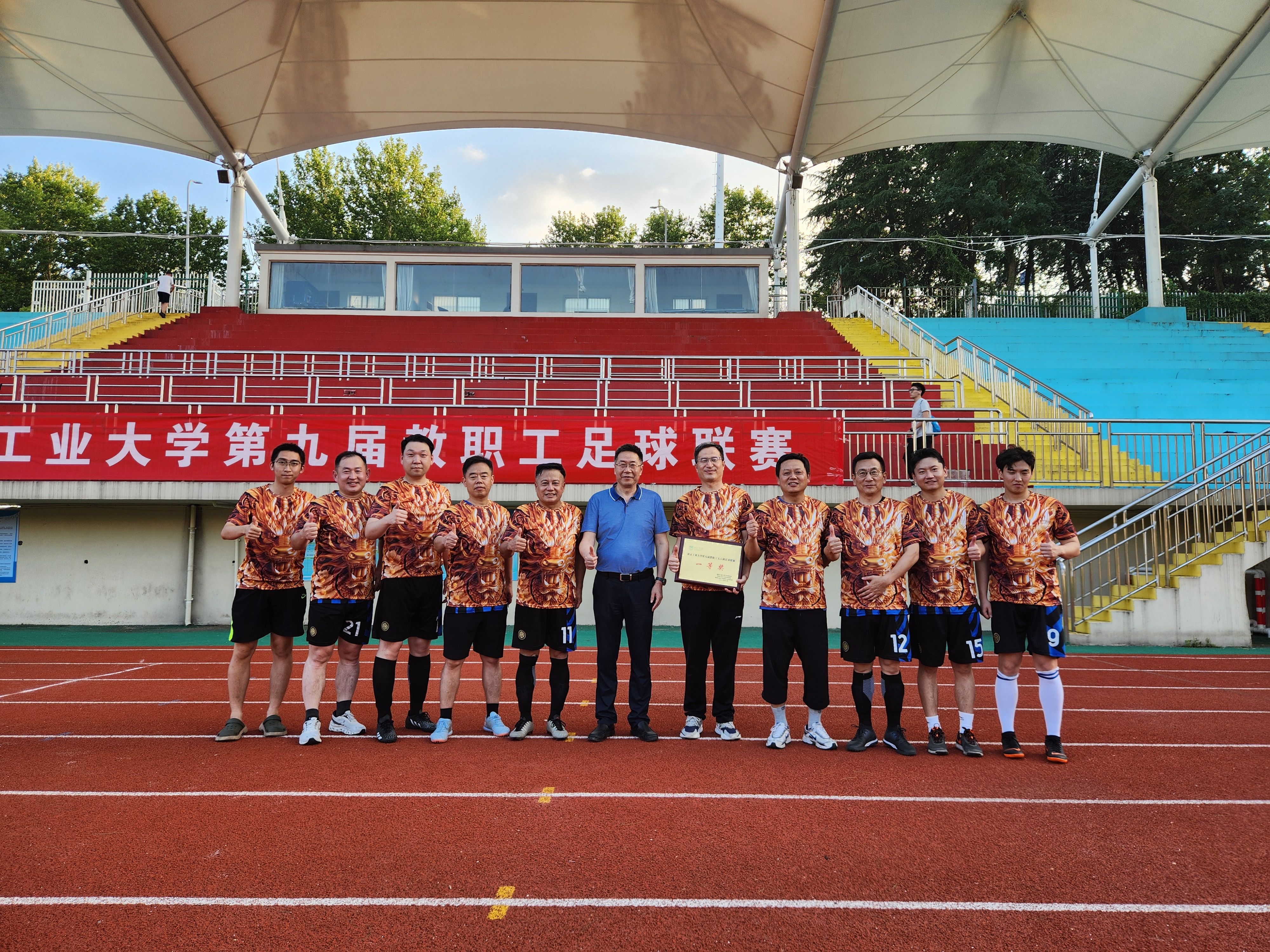艺术设计学院张鹰、王志强、于众、阎一博、张羽清等5位老师参赛,均有关键进球和上佳表现。联队全体队员们一路披荆斩棘,凭借卓越的球技、灵活的战术、顽强的斗志和出色的团队协作,最终在决赛中以2比0战胜校部机关队,成功捧起冠军奖杯。