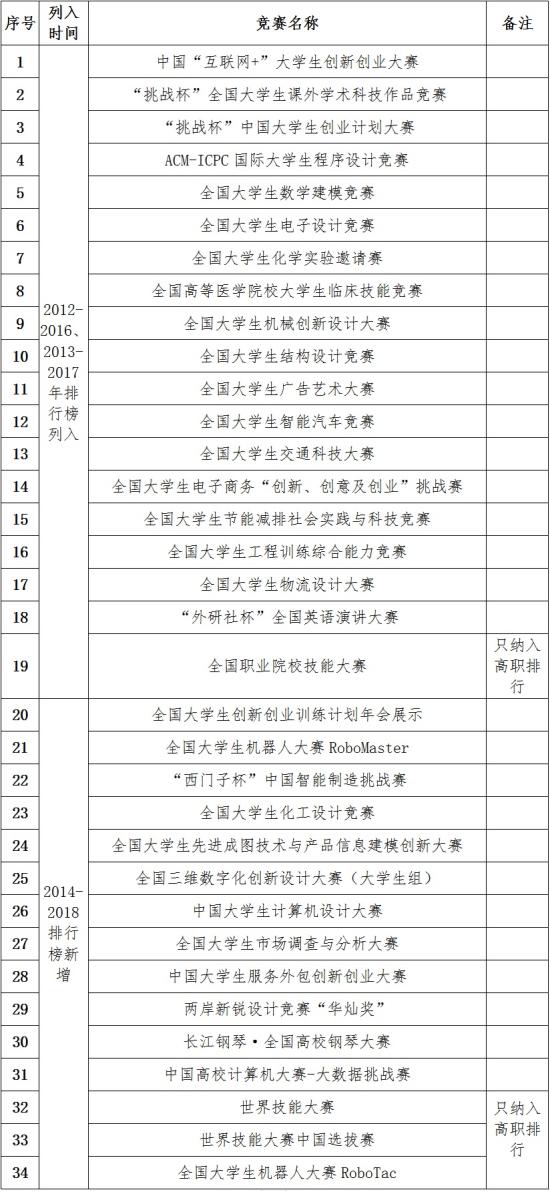2019年1月19日,高校竞赛评估排行榜专家委员会第二次会议在杭州召开,会议通过无记名投票,通过15项竞赛新增列入2014-2018年高校竞赛排行榜,其中本科类竞赛12项,高职类竞赛3项,列入排行榜的竞赛项目从原来的“18+1”项转变为“30+4”项(具体竞赛名单请见表1)