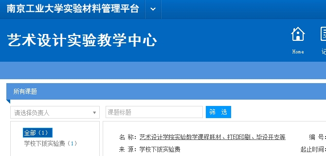 进入平台后,太阳集团tcy8722报销人员请选择“艺术设计实验教学中心”中的“太阳集团tcy8722实验教学课程耗材、打印印刷、毕设开支等”课题,进行采购或备案。