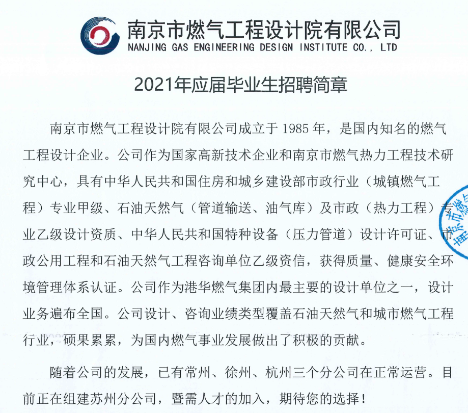 南京燃气工程设计研究院2021年应届毕业生招聘简章