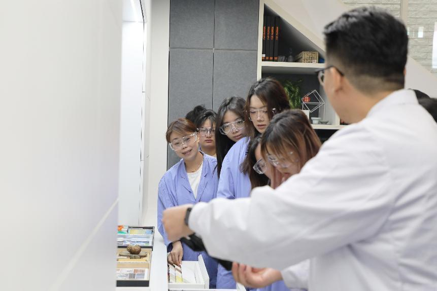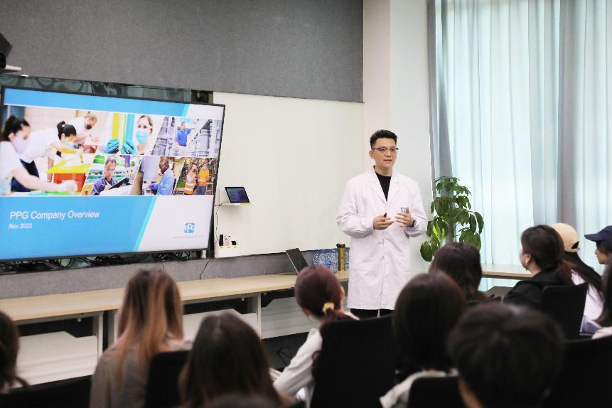 首先,PPG中国应用创新中心乔经理为大家介绍了PPG公司发展历程及应用创新中心发展现状,并对参观过程中的安全注意事项进行了细致说明;随后色彩设计部薛卫经理为大家深入阐述了PPG“保护并美化世界”的宗旨及可持续发展目标,并详细分享了PPG色彩团队对全球色彩趋势的预测分析及PPG 2024年度流行色系列“Limitless”;之后,在赵宏艳女士等多位专家的带领下,师生分组参观了应用创新中心的测试实验室、色彩工作室及各办公空间等。
