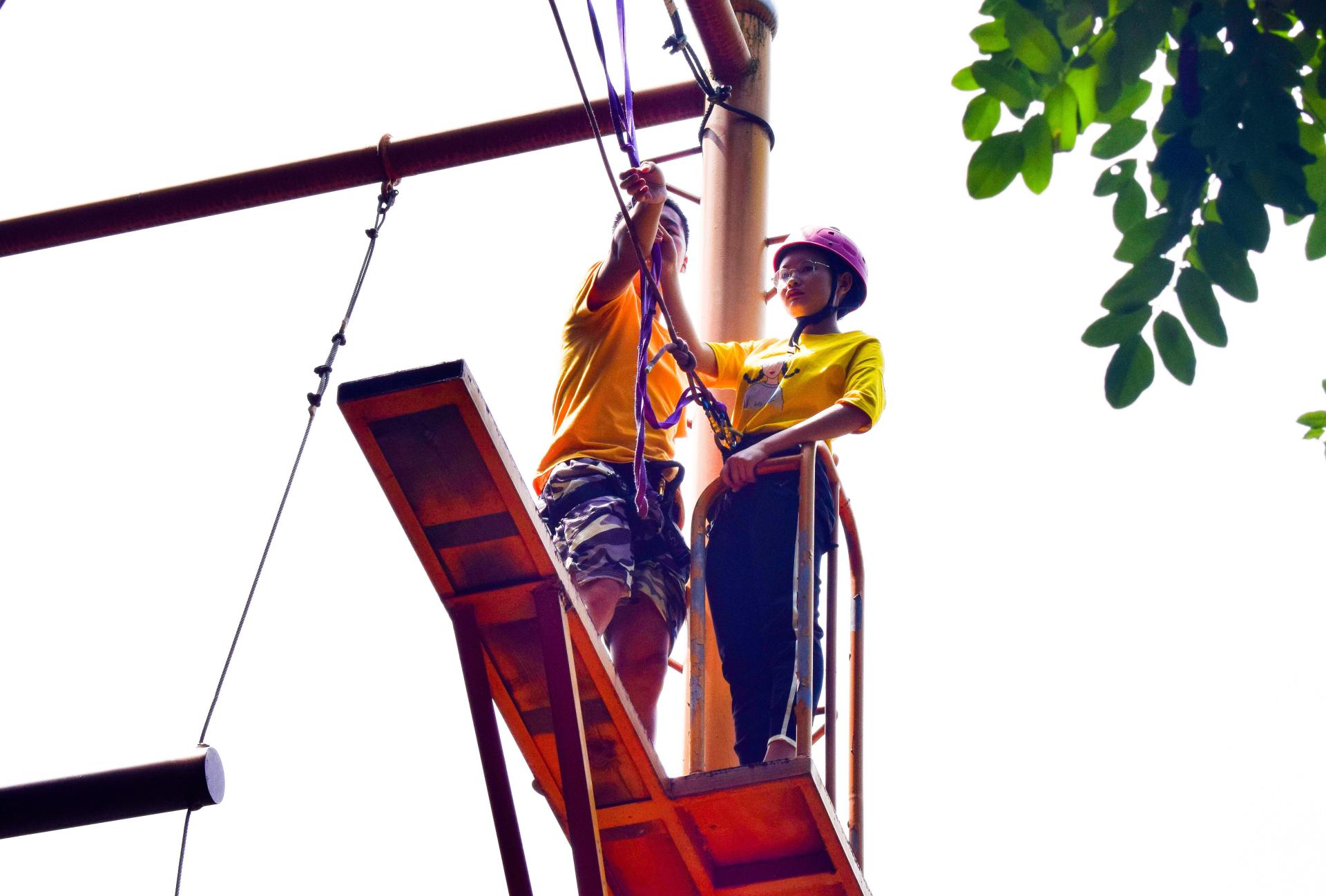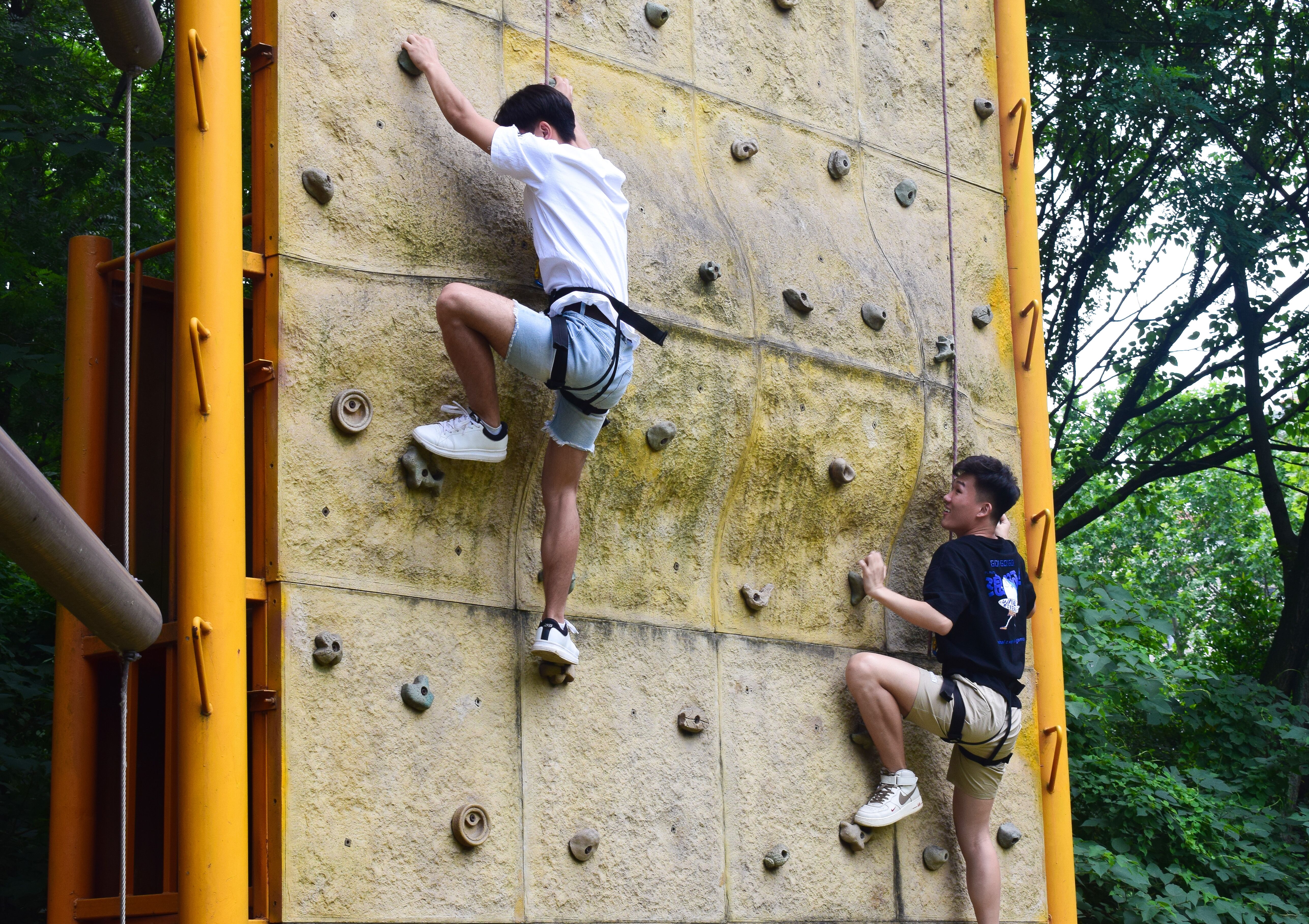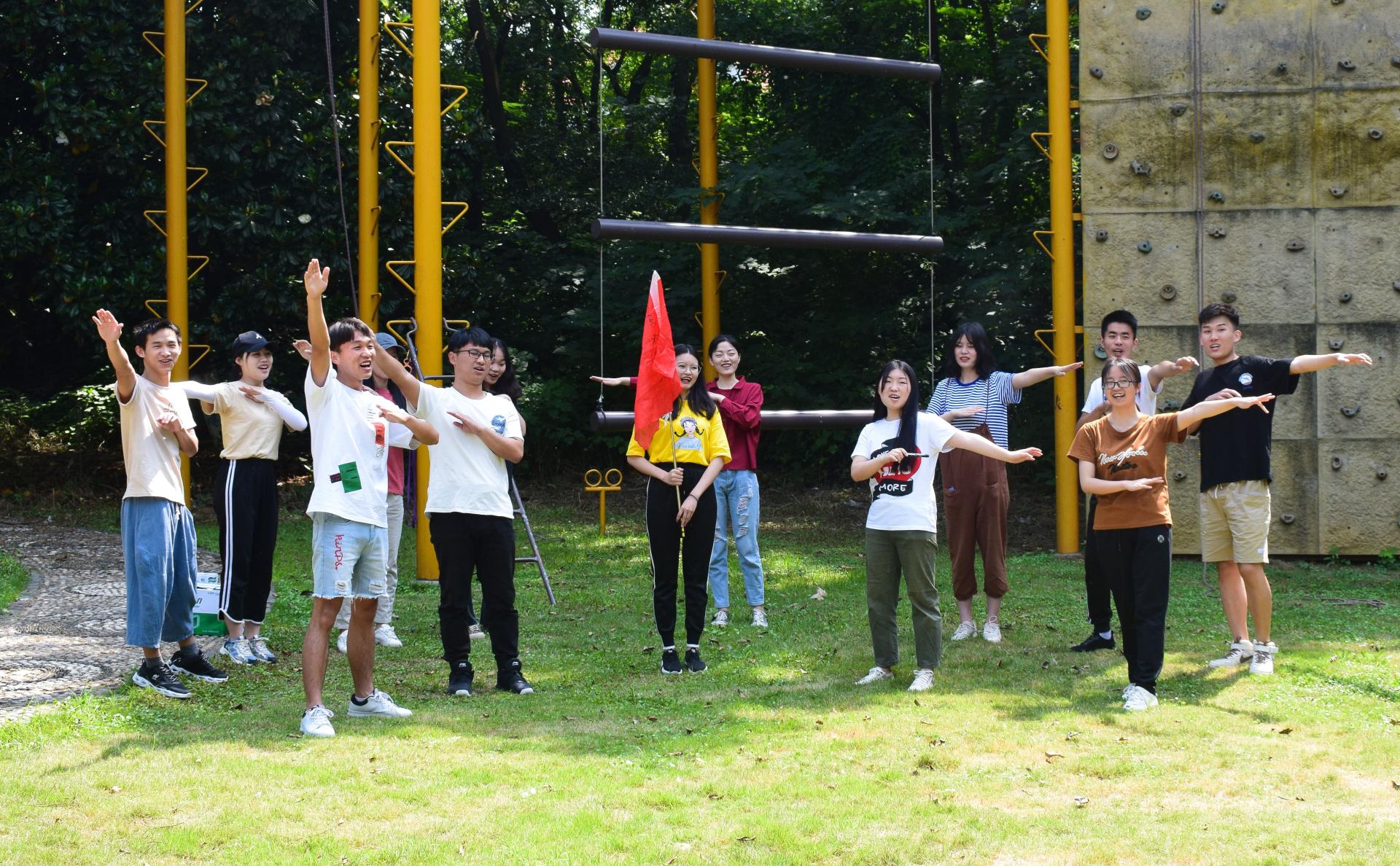 在朱巍巍老师的带领下同学们分成两组,群策群力想出队名与口号并绘制了队旗。首先开展的“钢铁森林”、“同心鼓”项目加强了同学们之间的相互信任,提高同学之间的团结协作能力,之后的“高空断桥”项目则是对同学们心理和身体素质的综合考验,即使是身材娇小的女同学,在队友的加油声中也能鼓起勇气面对断桥凌空跨越,这更是对团队精神的考验。最后的“高空攀岩”项目将本次活动推向了高潮,队员要攀上近3米的攀岩壁,锻炼体能的同时磨练毅力与勇气。在整个训练过程中,所有员工都踊跃表现、积极配合,既锻炼了身体,又发挥了智慧,既熔炼了团队精神,又突破了自我极限。