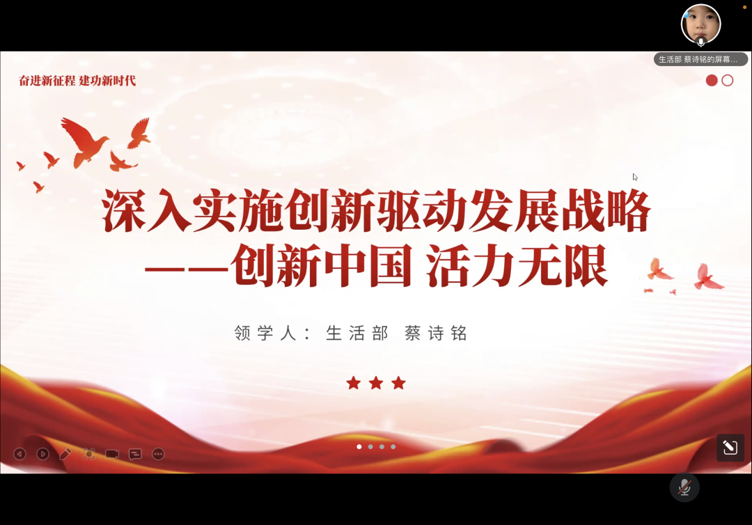 会议伊始,黄淑怡带领同学们一起观看新时代中国经济建设的相关视频,共同领略中国经济十年来的高速、高质量发展。随后,设计部韩啸通过图文讲解的方式展示新时代中国新技术新动能的蓬勃发展,展现中国经济、中国新技术的旺盛活力。最后,生活部蔡诗铭从创新驱动战略出发,通过图文讲解展示中国数十年的科技创新,说明了科学技术是经济发展的强大动力和坚实基础,激励同学们要坚定创新思维、敢于迎接挑战。