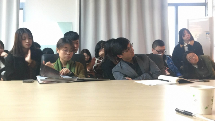 黄晓靖总监基于专属趋势四步预测法,结合设计项目与案例,从研(消费升级中的后物欲)、羽玻璃(短暂悬浮的城市白日梦)、共我体(联合个体的多元创新社)、暗物智(暗中涌动的智化思潮)等四个主题分享了2018-2019四大设计趋势。并对应每个趋势主题,提出了色彩、材质、表面处理(即Color,Material,Finish,简称“CMF”)的提案。分享会后,黄总监与老师们作了短暂交流。
