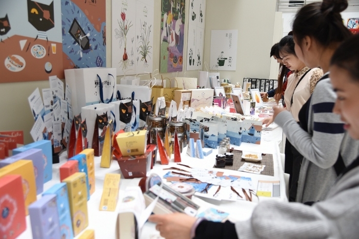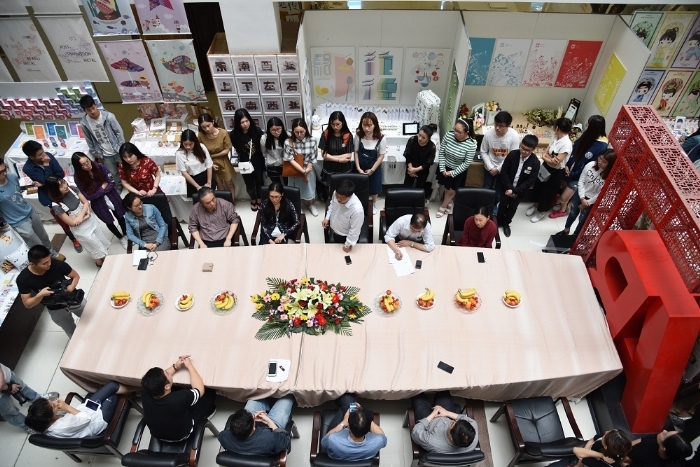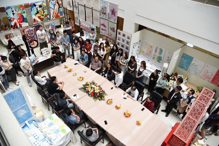 开幕式之前,在公司陈建华书记、赵慧宁经理、薛以平副经理、吴琼副经理、黄慧明副书记及专业指导老师等陪同下,副书记副董事长高明和公司教学事务部何其玲副部长等参观了全部作品展,并与同学们进行亲切交谈,认真地听取同学们对作品的介绍,了解同学们的创意理念。本次展出作品涉及多个领域,形式新颖,既不失中国传统文化的传承,又有现代感的突破与创新。