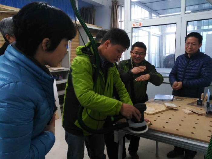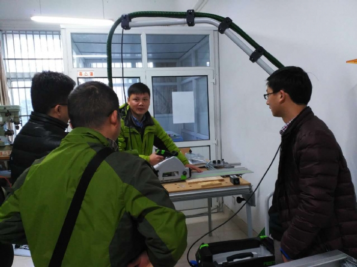 费斯托厂家特派技术员方定顺先生在两名助手的协助下,深入浅出地讲解与示范了板材精密切割设备、钻孔设备、开榫设备、修边设备以及无尘打磨设备等的操作要领。一边理论讲解,一边操作示范。其间,参与培训的老师还饶有兴致地分别体验了下部分木工设备的常规操作,均对费斯托木工设备的安全性能赞不绝口。