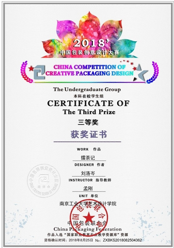 近日,由中国包装联合会主办,《包装世界》杂志社、中国包装创意设计中心、《中国包装》杂志社等联合承办的“第八届中国包装创意设计大赛”终评揭晓,公司太阳集团tcy8722孟刚老师指导的2016级视觉传达设计专业员工李宏越的作品《南川贡米》和刘洛岑的作品《擂茶记》均获三等奖。