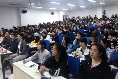 公司同学们参与热情高涨,讲座还未开始,教室中已座无虚席,表现了学子强烈求知欲。全校最大的阶梯教室都容不下,连教室前后门都围满了前来聆听讲座的同学们。