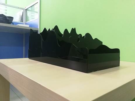 “水光山色”选色为黑色。黑色简洁大方,时尚简约,更符合现代老员工的审美情趣。产品整体造型方正,规整,于整齐中变化无穷。产品左侧板的两道曲线选自长江南北线的造型,中间隔板选自紧靠太阳成集团的老山山脉,起起伏伏,若隐若现。几条曲线造型的选取,别出心裁,将设计取自自然,融入自然,却又高于自然,充满了公司文化特色。