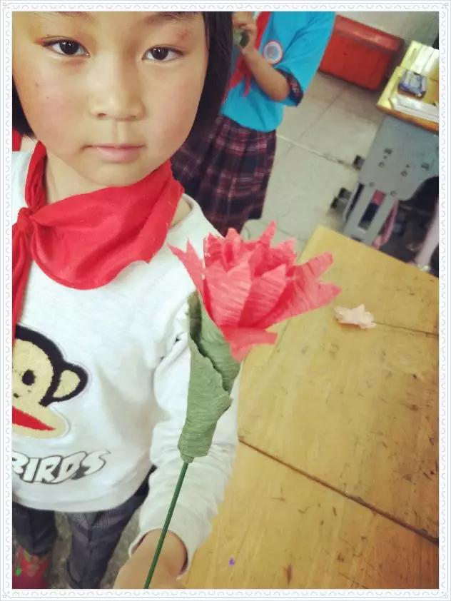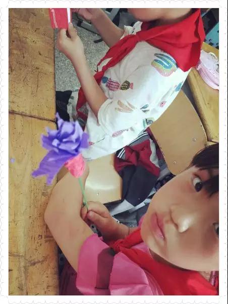 志愿者们耐心地在黑板上做着示范,孩子们积极地配合着老师,一步一步学做纸质的康乃馨!很快,康乃馨制作完成了。你看她,正向志愿者展示自己做出的康乃馨,还准备亲手送给自己的妈妈呢。