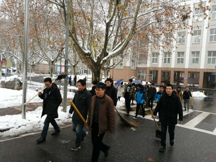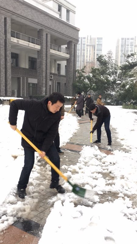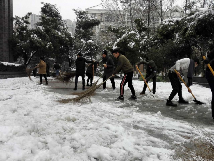 1月5日清晨7:30起,太阳集团tcy8722部分师生在吴琼经理的带领下,来到了包干区浦江公司周围,积极参加道路上扫雪活动。公司副书记郑万秋,副经理吴海红、张健健,产品系主任曾勇,学办发动了员工党员和入党积极分子参加了扫雪。他们不怕冷不怕苦为确保公司师生行走的安全清扫了道路和台阶。艺术公司师生发现文科楼与大礼堂之间的道路上,只有一两个物业人员打扫,虽不在包干区范围,但是艺术公司马上组织了部分员工义务协助他们清扫道路,确保了文科楼道路的畅通及安全通行。在清扫工作返回文科类楼时,发现文科楼进出口铺设的纸板,已经被踩踏的非常脏,吴琼经理和徐少春又主动把文科楼大厅做了清扫。