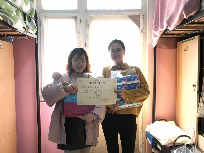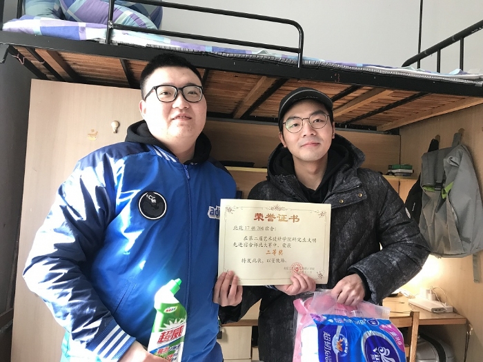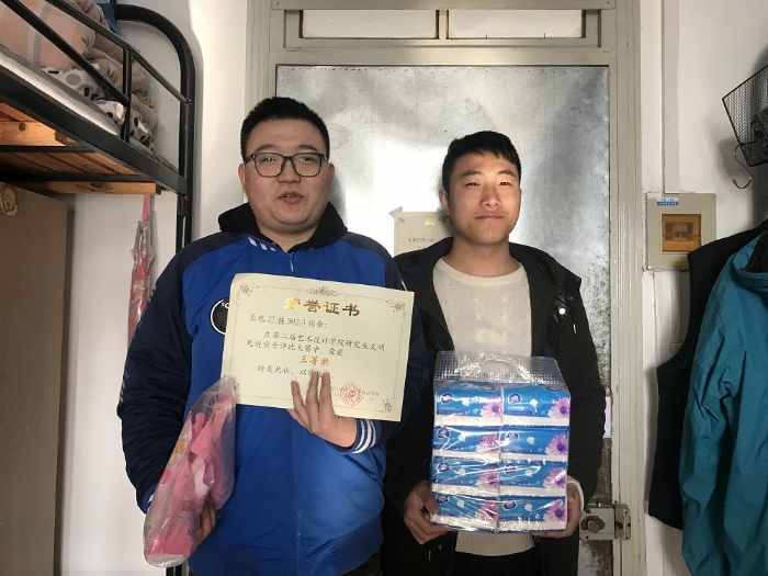 本学期公司研究生文明先进宿舍评比大赛,依据11月与12月的宿舍卫生和安全评比结果平均分作为评比标准。北苑17栋206、北苑17栋204、北苑27栋502-3,分别获男生宿舍一、二、三等奖,西苑E2栋101-2获女生宿舍一等奖,西苑E2栋201-3和E2栋101-3并列获女生宿舍二等奖,西苑E2栋303-4和西苑E2栋303-3并列获女生宿舍三等奖。