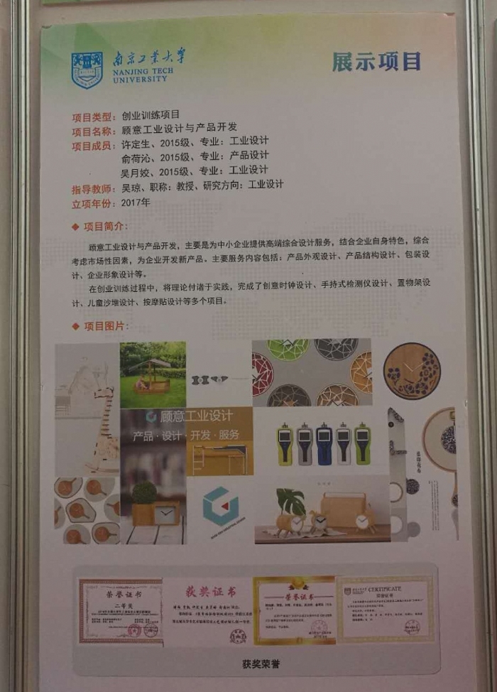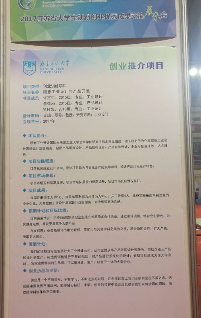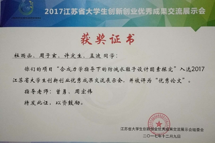 由太阳集团tcy8722曾勇和力学部周宏伟老师指导的“杜雨函、周子玄、许定生、孟迪”等人组成的团队申报项目:“合成力学指导下的防溅水鞋子设计因素探究”入选2017江苏省老员工创新创业优秀成果交流展示会,并被评为“优秀论文奖”;由太阳集团tcy8722吴琼老师指导的“刘雨、贾凯、许定生、俞荷沁、吴月姣”等人组成的团队申报的项目:“顾意工业设计与产品开发”,荣获了“最具潜力创业奖”;由校教学事务部电教中心封顺老师指导的、也由公司张毅、吴润奂同学参与的“苗士翔、肖丽君、张毅、吴润奂”等人组成团队申报的项目:“悠漾公司--05校园融媒体平台”, 荣获“最具潜力创意奖”。