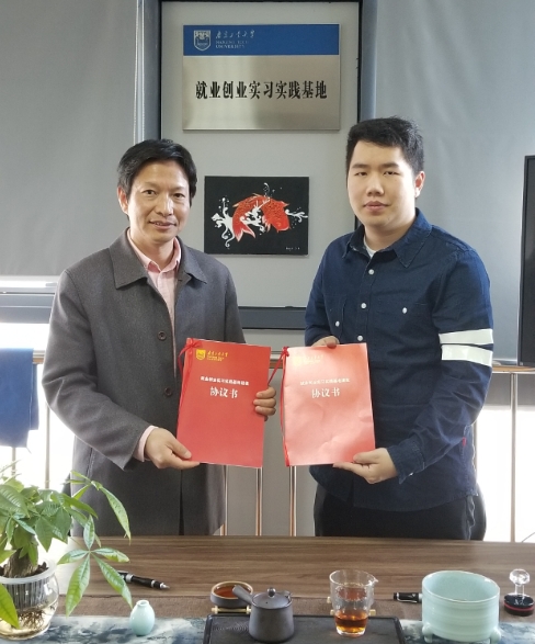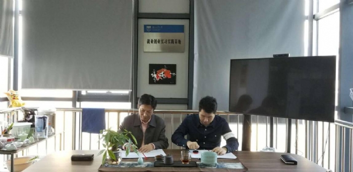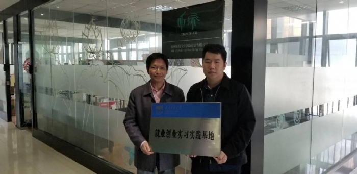 产品设计系系主任曾勇老师和扬州昕绿文化创意设计有限公司负责人王省先生签署老员工就业创业实习实践基地合作协议并进行授牌。