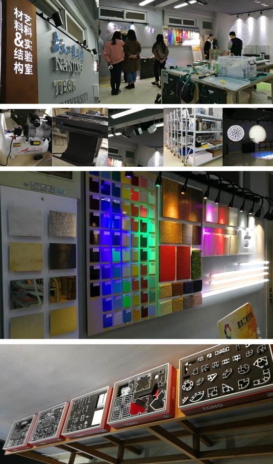 此实验室由钱凤德与朱仁洲等老师负责具体实施,二位老师为采购教学环节最需要的新型材料与常用设备,带领部分员工多次往返于南京金桥和板桥装饰材料市场,通过向业内企业沟通咨询,基于市场需要,逐步确立了最终的材料与设备采购框架。形成了建筑装饰材料、装饰工程工艺、广告输出制作工艺、店面标牌制作工艺、便携展示器材及结构搭建材料、展示灯光及测量仪器等六方面相关内容,可为艺科专业本科生的会展搭建、材料预算以及相关基础设计课程提供辅助教学。实验室建成改善了艺科专业本科教学的基本条件,改变了以往员工仅仅只能通过书本讲解,而无法真正深入了解专业材料与制作工艺的被动局面,从而更好地为本科生高年级员工专业设计学习打下扎实基础。