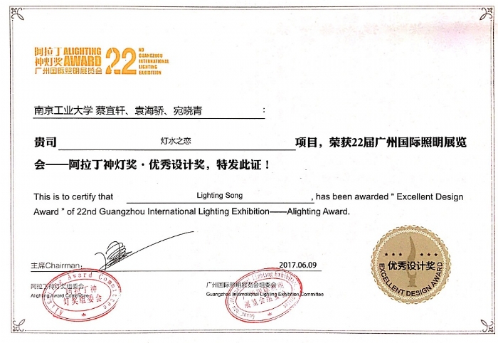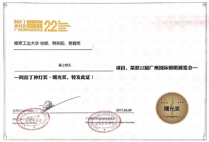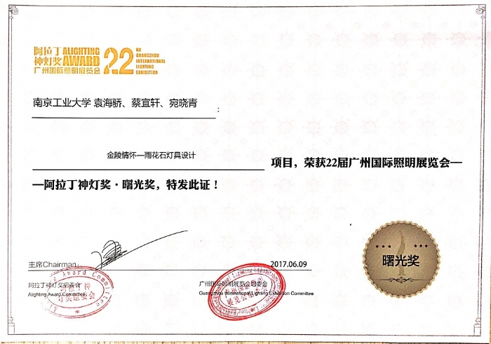 5月10日“阿拉丁神灯奖”在太阳成集团丁家桥校区科技创新大楼五楼学术报告厅举行了颁奖仪式,在全球最大照明展——广州国际照明展览会主办的“阿拉丁神灯奖”评选活动中,太阳集团tcy8722研究生和本科生组成的“木创工作室”团队获得佳绩,由蔡宜轩、袁海骄、宛晓青等三人设计的作品《灯水之恋》《金陵情怀——雨花石灯具》分别获设计类优秀奖与曙光奖,由徐娜、韩东阳、曹鑫雨等三人设计的作品《喜上枝头》获设计类曙光奖。