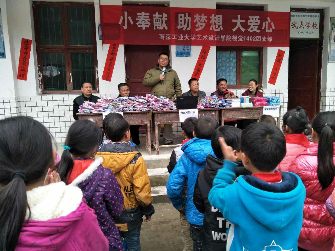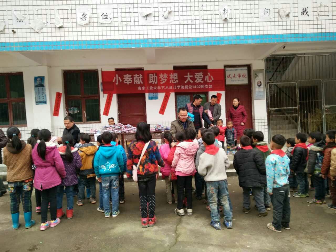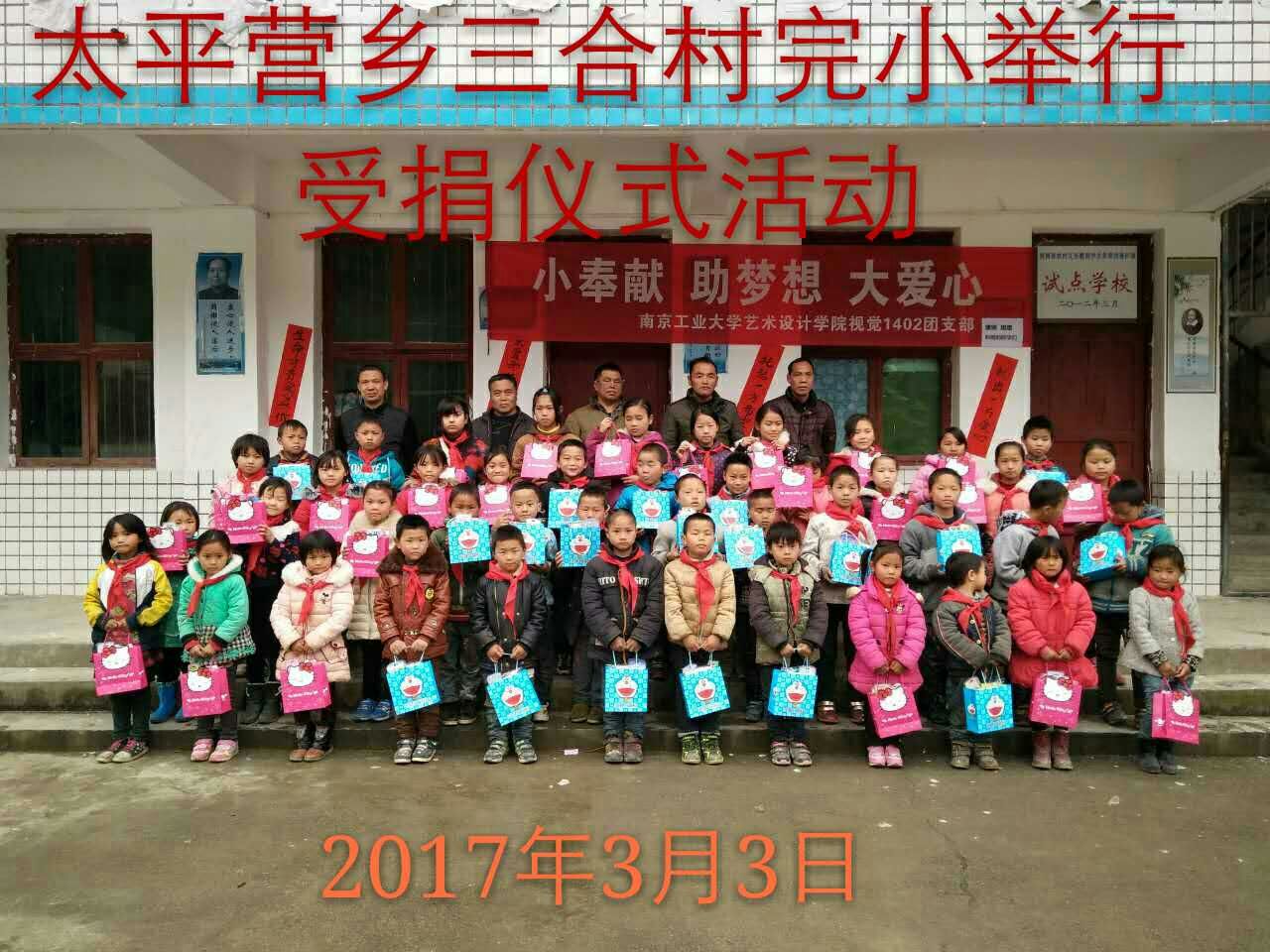 义卖获得的学习用品等资助给了贵州省铜仁市松桃苗族自治县太平营乡三合村完小员工,那所小学地处偏僻,学习环境较为恶劣,且交通不便,团队力量薄弱,尽有5名在校职工,整个公司师生大概在50人左右。三合村完小董事长得知视觉1402团支部代表前去捐助学习用品时,十分感激,还特地邀请那里的社区代表和家长代表到校参加受捐仪式活动。