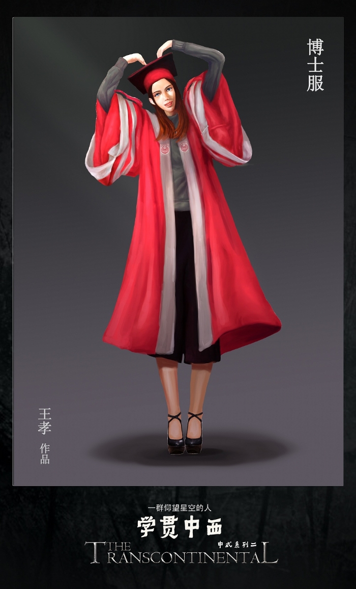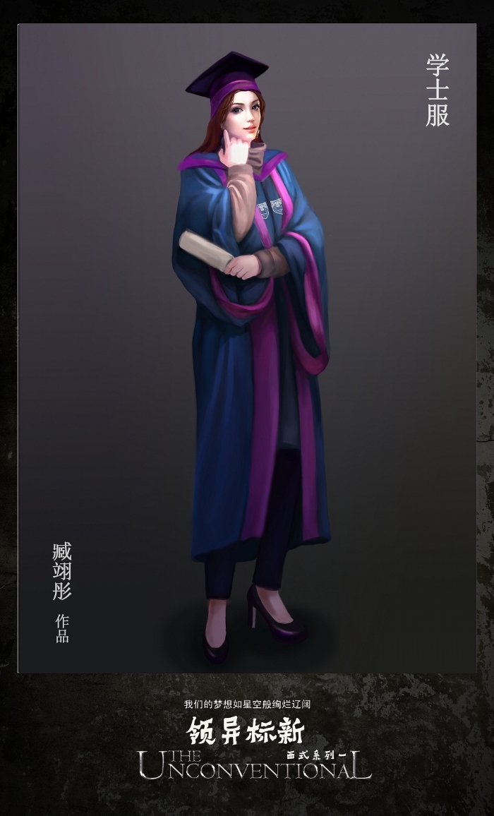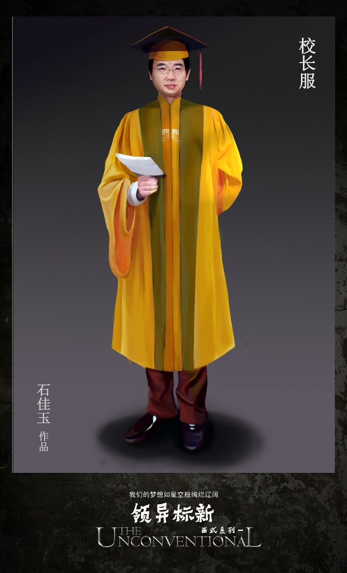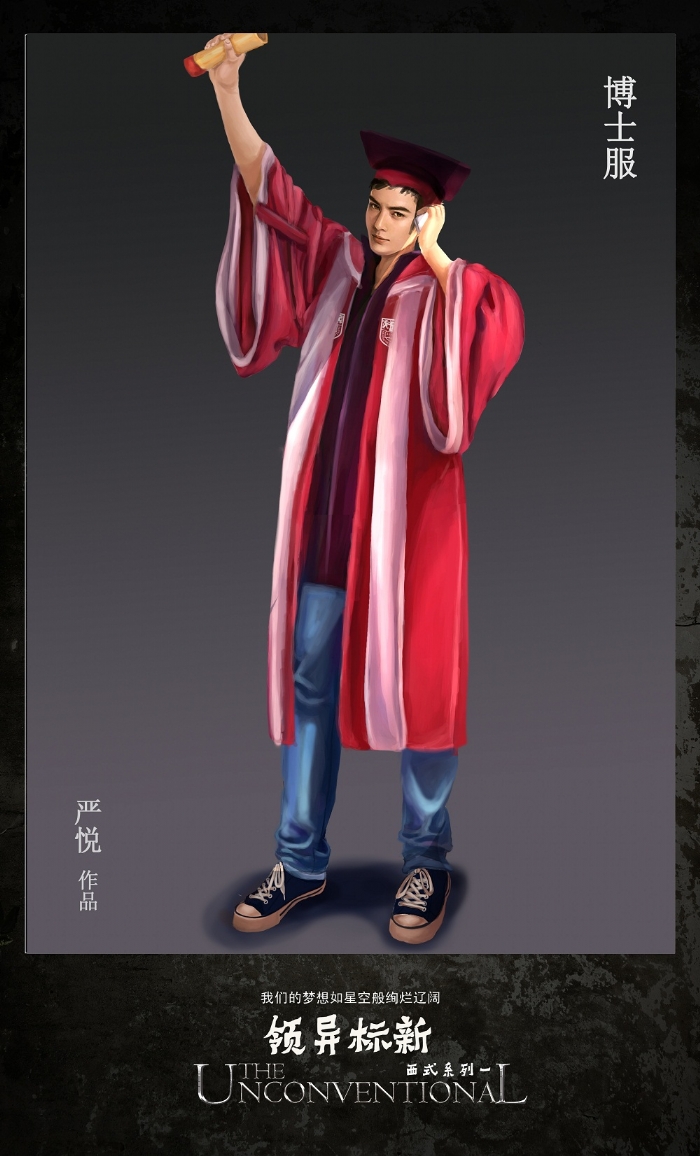 为了完整地展示学位服的风采,10位女生为学位服创作了20张数位板手绘效果图。这件任务的艰巨性在于,她们要在繁重的课业压力下,挤出时间去憧憬毕业生、导师、董事长身着学位服的神采,想象人体的结构姿态、表情的一颦一笑,衣服的纹理皱褶,然后选择美好的视角去表现它们。或许她们的作品还有些不尽如人意的地方,或许它们的作品只是为了配合学位服展示效果的瞬间闪现,但她们历经不足两月,数易其稿,所付出的辛劳,同样收获了信心和能力的积累。“台上一分钟,台下十年功”,说的正是这些在台前幕后甘当绿叶默默付出的人们。
