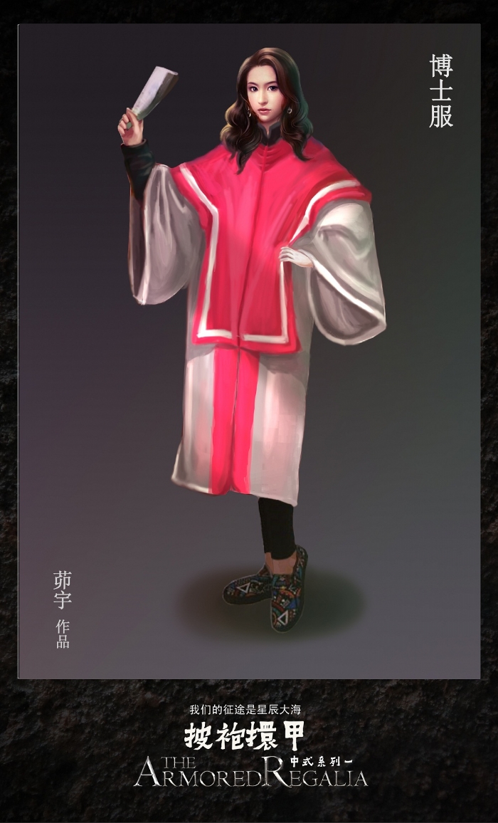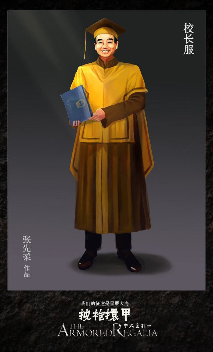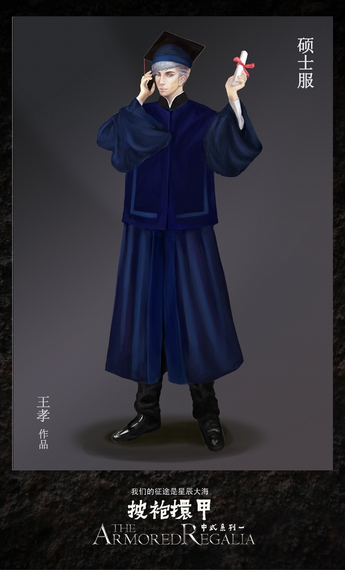 设计理念:成语的本意是战士穿上战袍,套上铠甲,做好战斗的准备。“甲”即披肩,“袍”即学位服底袍,这里引申出在毕业典礼上,青年学子濯缨弹冠,带着师长的美好祝愿,慷慨壮行的情景。