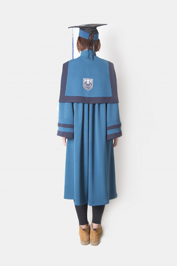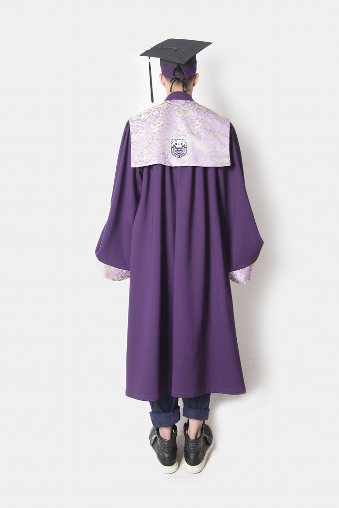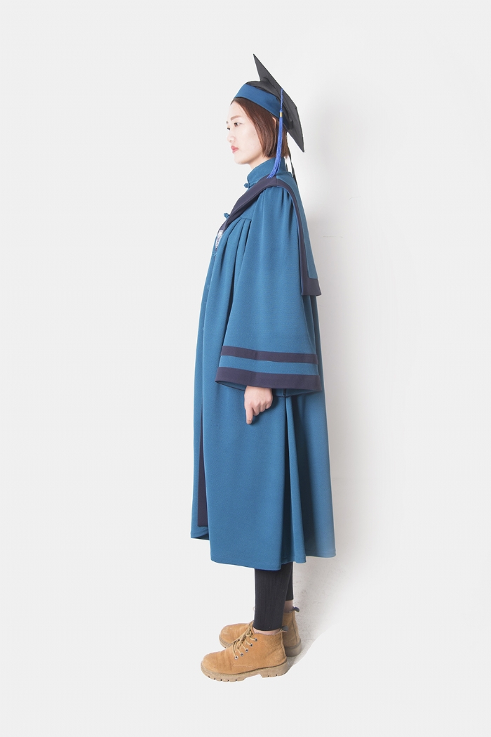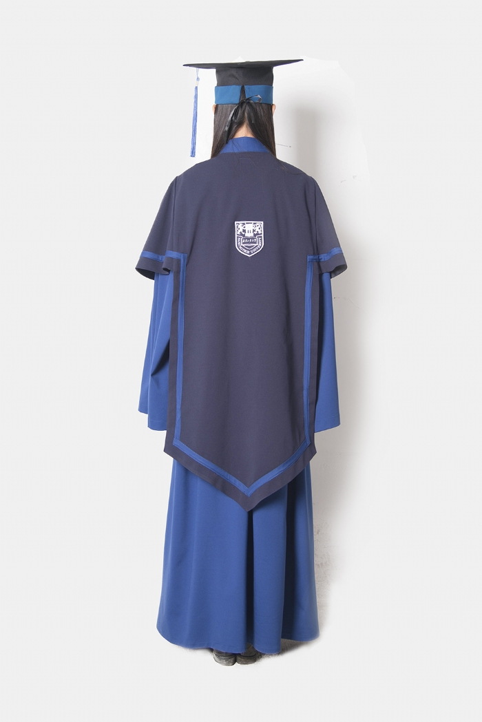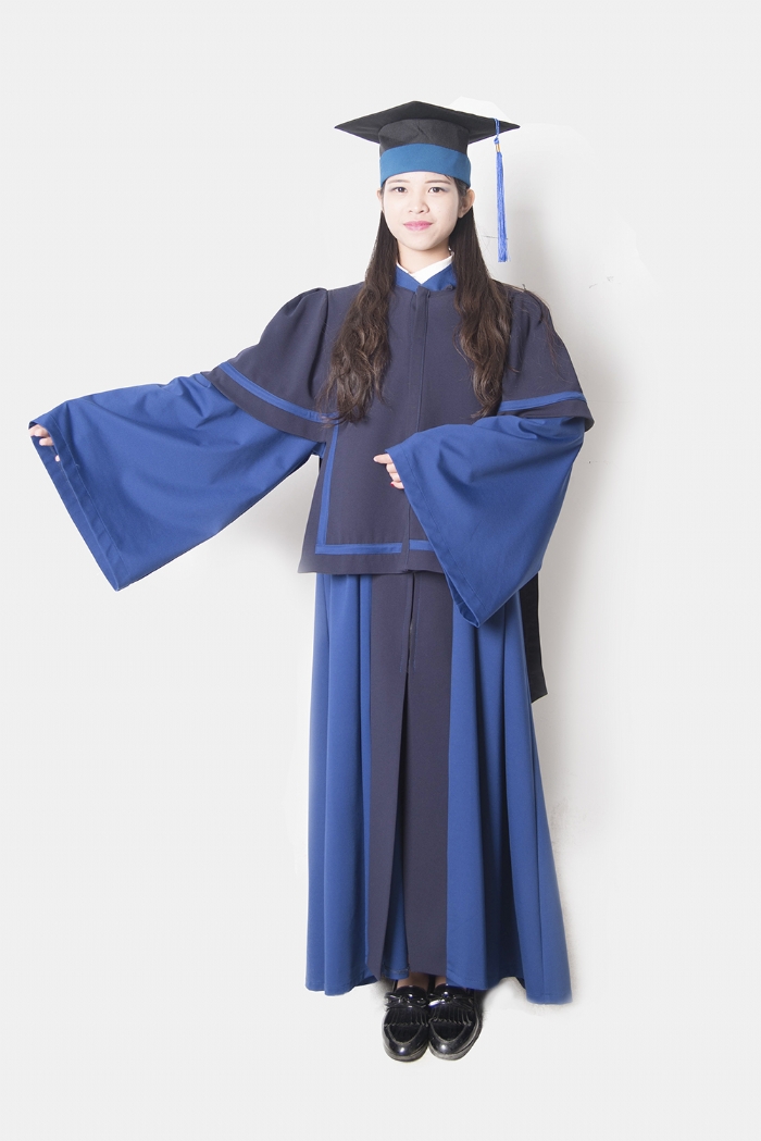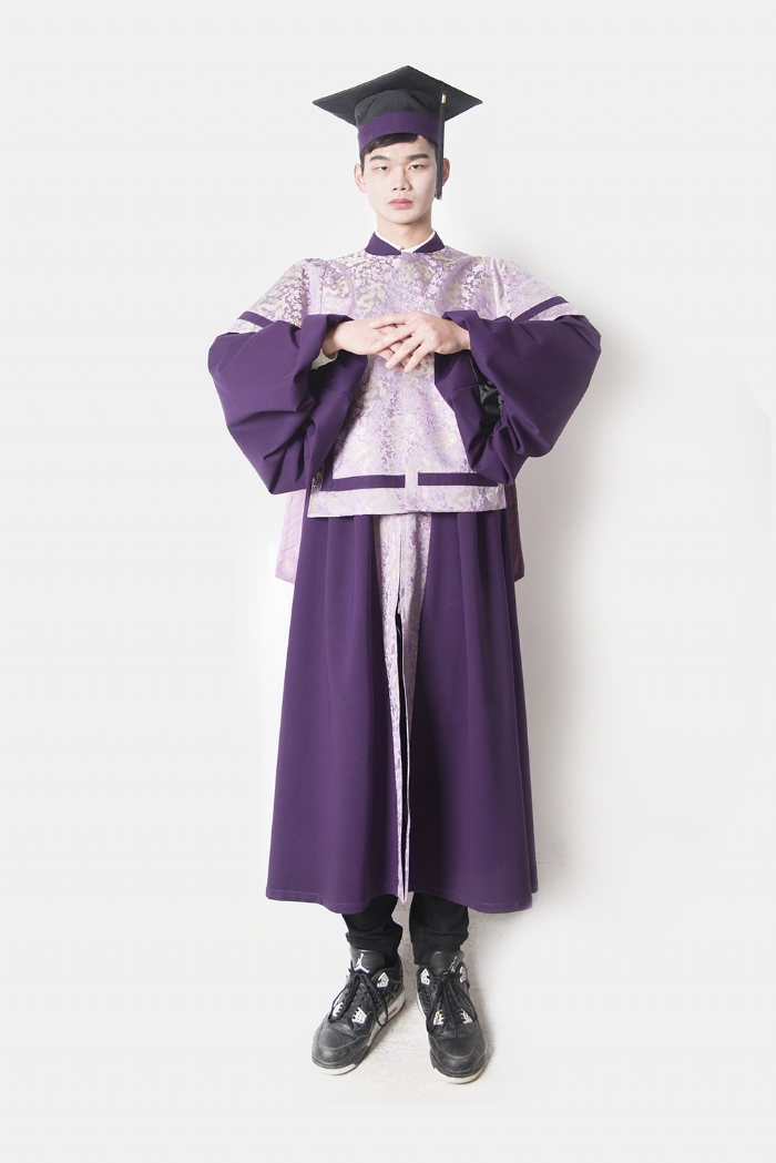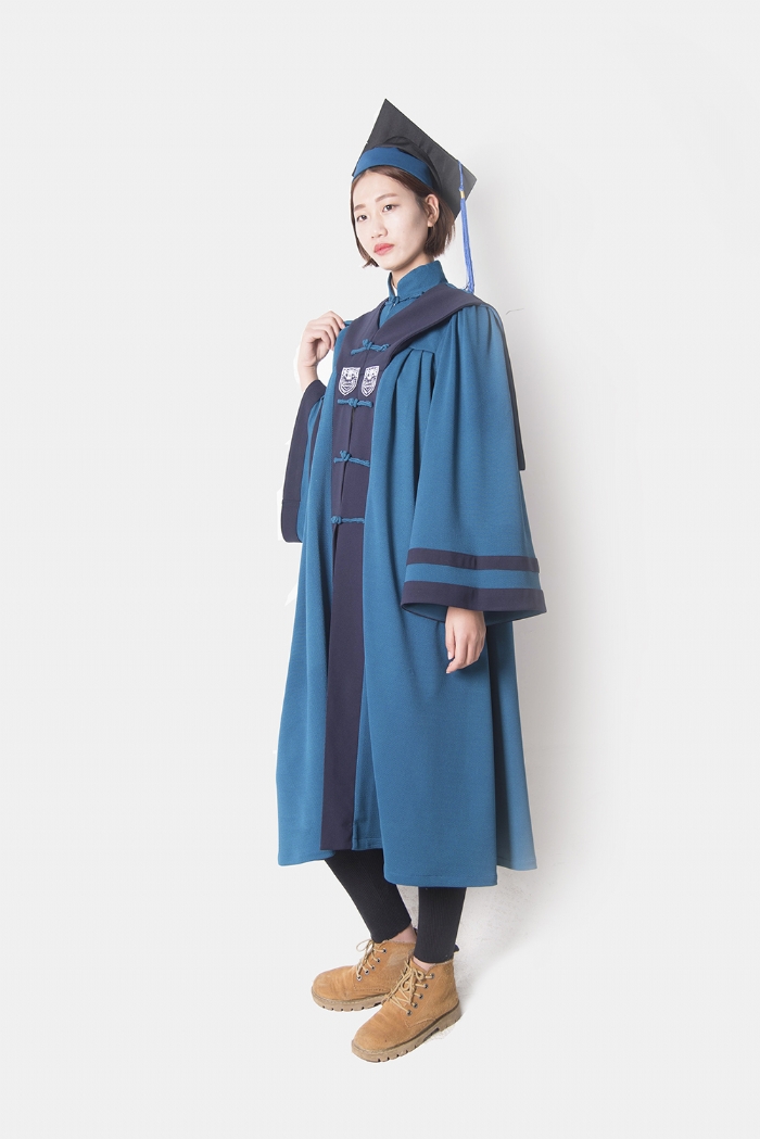 中式、欧式两个系列均按照统一的色彩模式进行设计,分别用普鲁士蓝象征学士服,地中海蓝象征硕士服,珊瑚红象征博士服,丁香紫象征导师服,梵高黄象征董事长服。