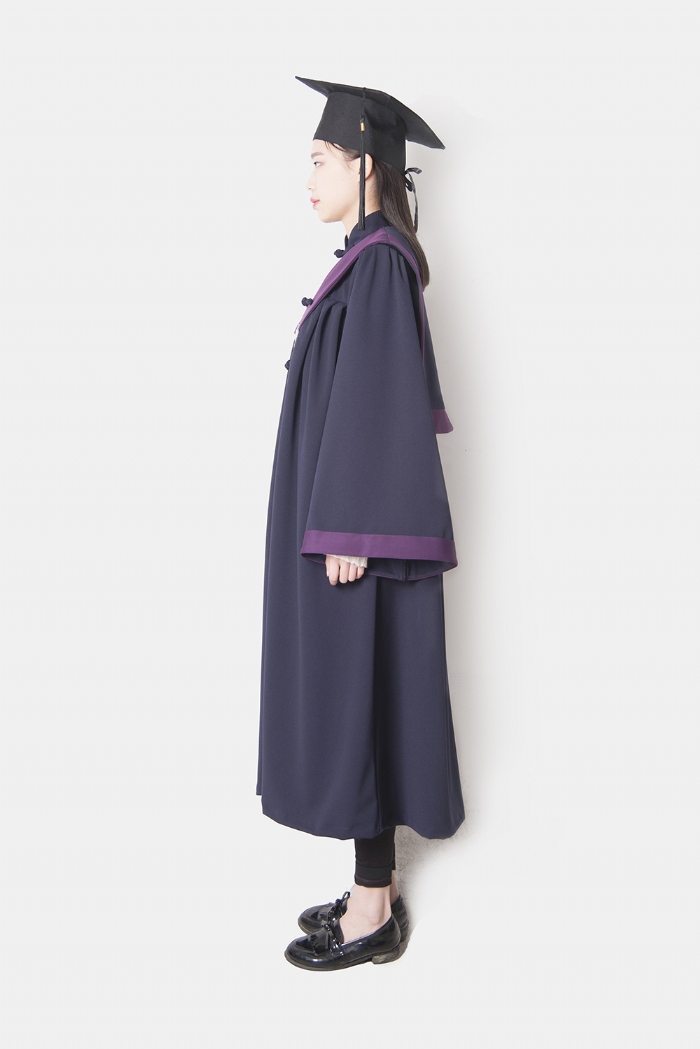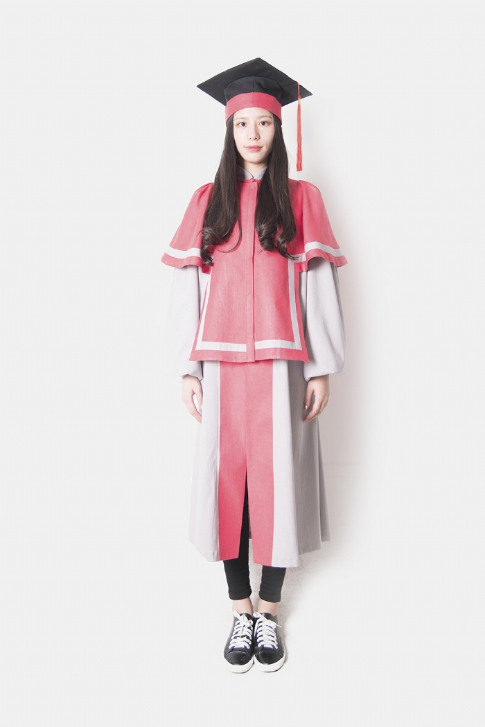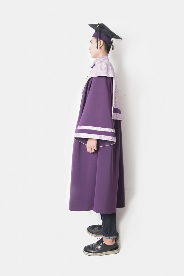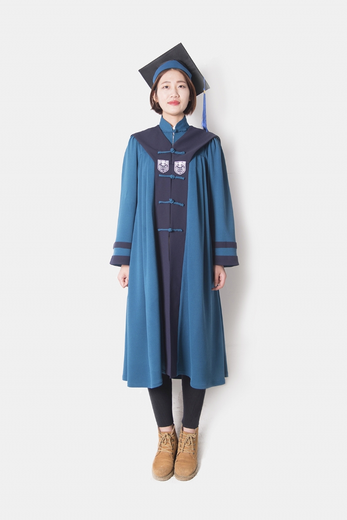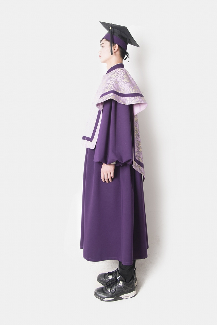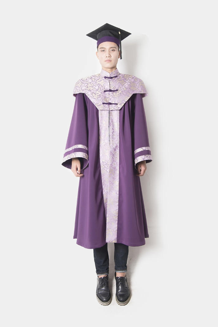 中式、欧式两个系列均按照统一的色彩模式进行设计,分别用普鲁士蓝象征学士服,地中海蓝象征硕士服,珊瑚红象征博士服,丁香紫象征导师服,梵高黄象征董事长服。