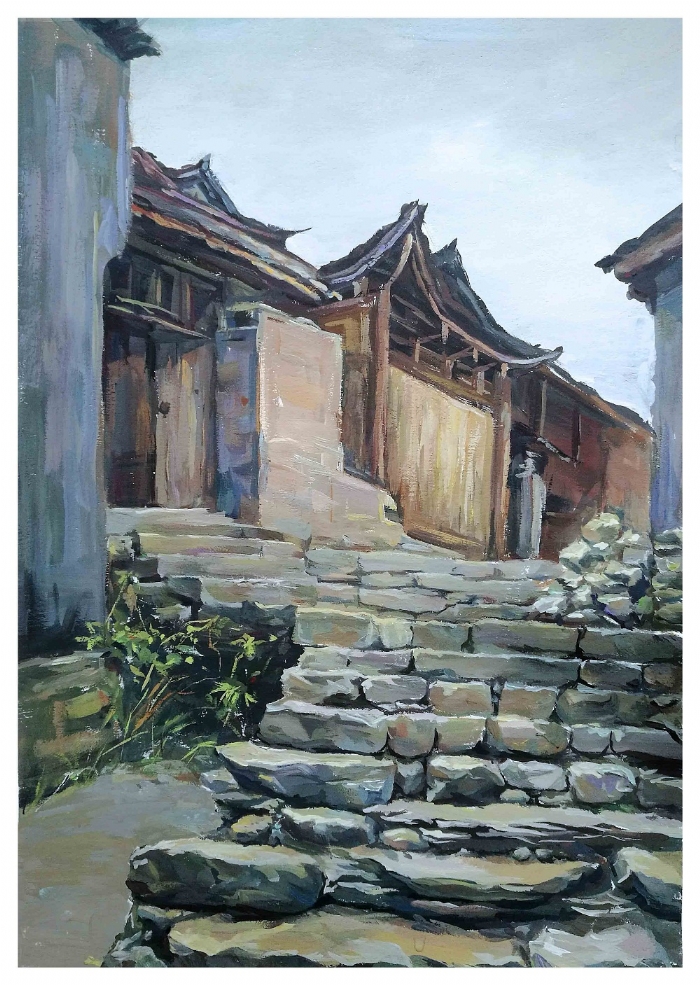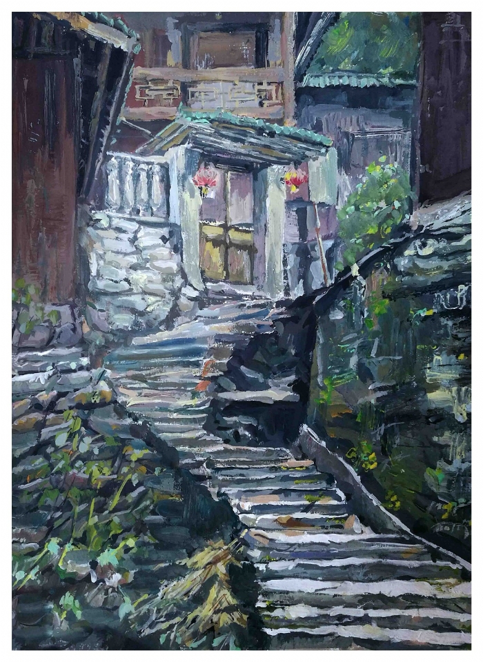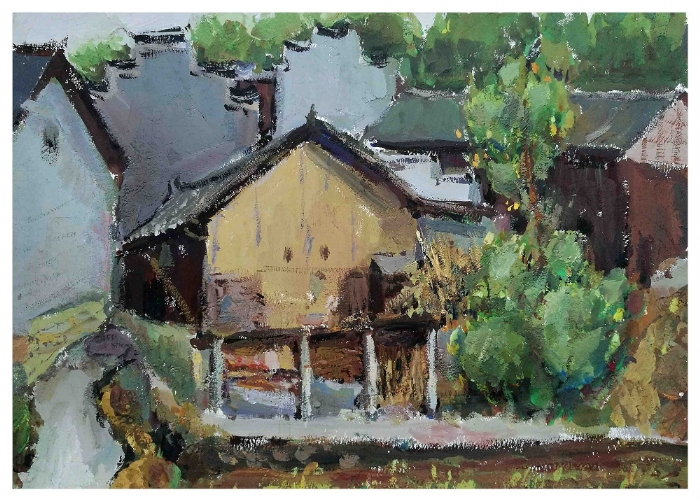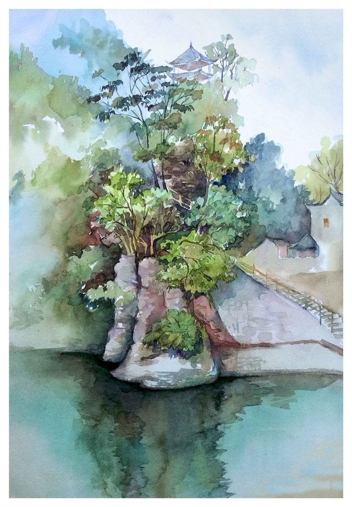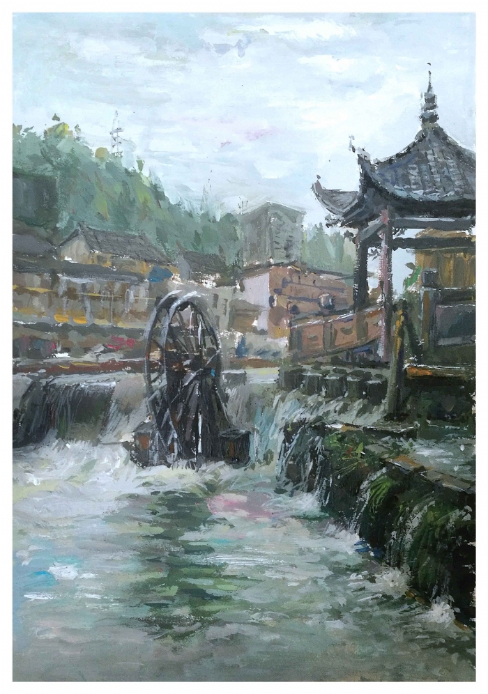 写生是此行首要任务,每到一处都有许多前来写生的画家和员工,我们已经迫不及待的加入其中,将这里美好的景色展现在纸上了。每天早晨和中饭后,都会在组长的带领下前往不同的景点,经历一番取景、摆画架、贴画纸、取水等等的忙碌后开始写生作画。尽管我们的动作有快有慢看起来似乎彼此心照不宣,可认真的时候时间总是过的很快,大家都在努力提高自己的技艺,尽力地去表现,画出无愧于这动人景色的作品。写生期间,天空有时晴、有时雨,可不管晴雨我们都会按时外出写生。在写生时,几位老师时常来到我们身后,给予指导与建议。在新寨写生时,薛老师为我们做了一次写生示范,老师的每一个明快笔触,微妙的颜色变化以及最终的表现效果,都给我们对绘画的理解与之后的写生以很多启发。随着时间和作画次数的增加,我们都在进步,逐渐有了画画的手感。大家越来越认真,在不断地洗笔挥笔的声音中,纸上画作愈加完善,也越来越生动。当每天天色的渐渐变暗,每次画完写生作业的时候,我们看着自己完成的作品,虽然存在着彼此进步层次上的差异,可每天都有或多或少的收获,每个笔触都注入了自己的感情,每一张画都尽力完善以求最好,都会露出欣慰的笑容。