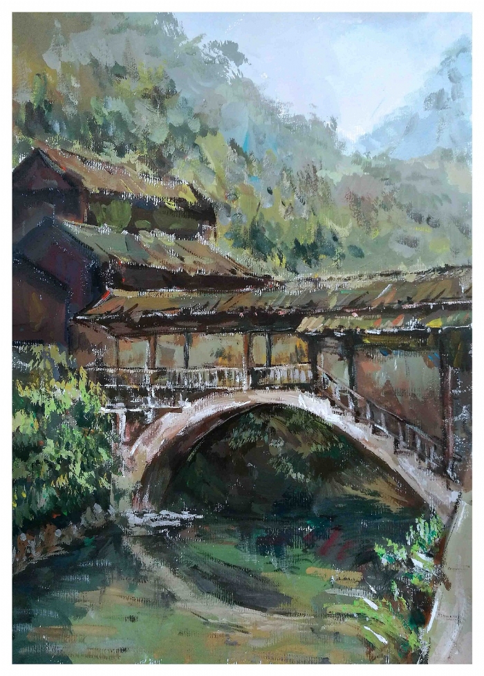 “矮寨”是也我们非常喜爱的写生点,它以苗乡风情为特色。矮寨是一个以苗族人为主的山区生态名镇,是一片用绿水与青山描绘的天地。矮寨洋溢着古朴浓郁的苗乡民族风情,村口高大的风雨桥,建立在大石块堆砌台基上独特的苗寨木板房、室内竹木陈设和火塘,以及苗家妇女华美的苗家服饰等等,无不闪烁着淳朴的民俗民风和悠远独特的民族文化特色。其实,不论边城的宁静之美、矮寨的浓郁风情之美,还是凤凰古城的缤纷热闹之美,各显风采,使我们的写生实习变得丰富多彩。