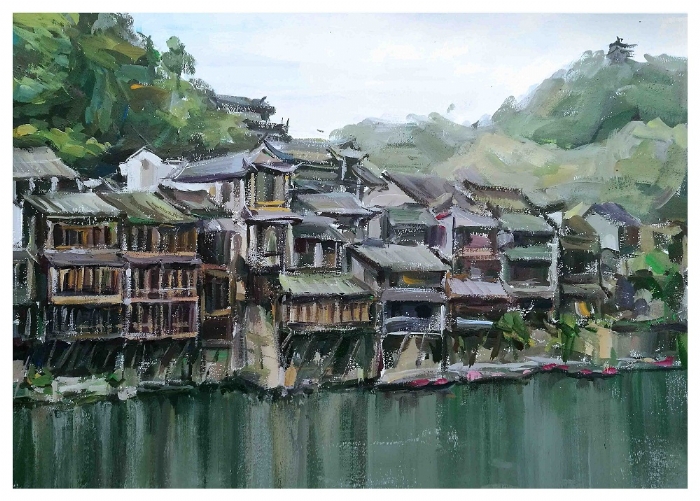 经过一天一夜的旅途,在一路欢歌笑语中,我们到达了此次写生的第一个目的地“边城镇”。这次湘西写生实习要去三个点:边城、矮寨和凤凰,这三个点虽都属于湖南省湘西土家族苗族自治州,可它们的特点还是有一定区别。边城和凤凰以古城镇风貌为主要特征,相比较“边城古镇”更多地体现出原生态特点,而“凤凰古城”更多地体现出现代商业特点。我们大多偏爱边城,就是因为置身边城,它没有太多的现代商业化痕迹,就像它的名字一样,处在城市的边缘,仿佛隔离在喧嚣世界之外。走在边城的条条小巷中,看着慢慢走着的或边吃饭边晒太阳的居民,这种宁静感令人羡慕;看着具有湘西特色吊脚楼,充满了历史沧桑的古旧木头,这份岁月感令人神往;看着吊脚楼水边石阶上,举着木棒槌洗衣服的女人,依然保持着传统劳作方式,这样的勤劳令人钦佩;再看着边城清水江边的拉拉渡,不禁让人想起沈先生《边城》中拉拉渡承载的老船夫的孙女,一个叫翠翠的女孩身上发生的凄美爱情故事,更是令人产生了诸多文化感想……。边城使我们深刻地体会到沈从文先生《边城》中描写的那份秀丽的自然风光、纯朴的民风及人与人之间真诚相待,相互友爱,这些一代代流传的古风习俗、人情世态所包含的人情美和人性美。