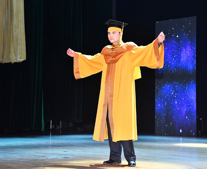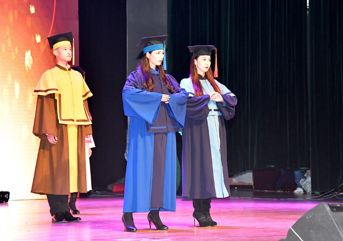 文艺晚会后,举行了创意学位服发布会,公司选派的20位美丽帅气的模特们穿上了由“创意学位服设计团队”花了三个月精心设计制作的富有时代气息、彰显公司特色的学位服,闪亮登场,分批次走向舞台中央,学位服分成中式和欧式两大系列,每个系列又分成两组别,每组别包括:学士服、硕士服、博士服、导师服、董事长服五类,分别用普鲁士蓝象征学士服,地中海蓝象征硕士服,珊瑚红象征博士服,丁香紫象征导师服,梵高黄象征董事长服。