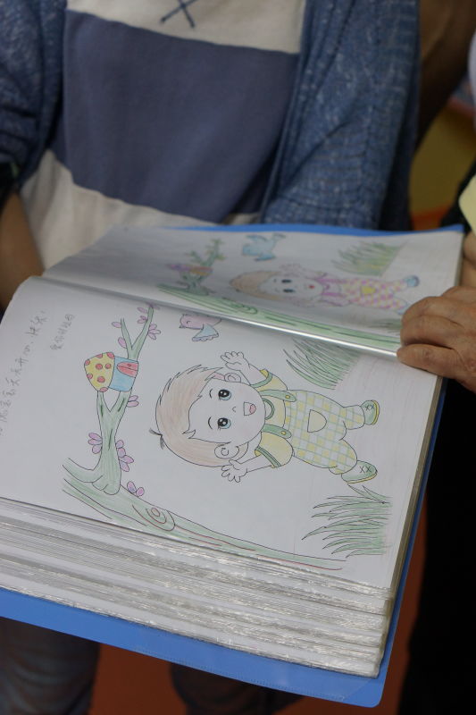 接着,院方半边天基金协会负责人又热情地向我们介绍了福利院一系列的详细情况。据了解,孩子们的生活环境相对良好,院方尽力给孩子们一个温暖的生活环境,让他们感受到亲情。看着墙上照片中孩子们的笑脸,得到了启发,此次福利院社会实践最好能给他们的环境增添艺术气息。另外,最令人印象深刻的就是每个孩子都有一本成长记录册,学会步履蹒跚、学会穿衣吃饭......,点点滴滴都被福利院的老师一笔一划的写进册里,卡通画与中国字图文并茂地展示于册中。这份特殊意义的成长册将会伴随他们一生,这对于孩子来说意义非凡。每一张被色彩和线条渲染的内页都是老师们送给孤残儿童的一份暖暖的礼物。