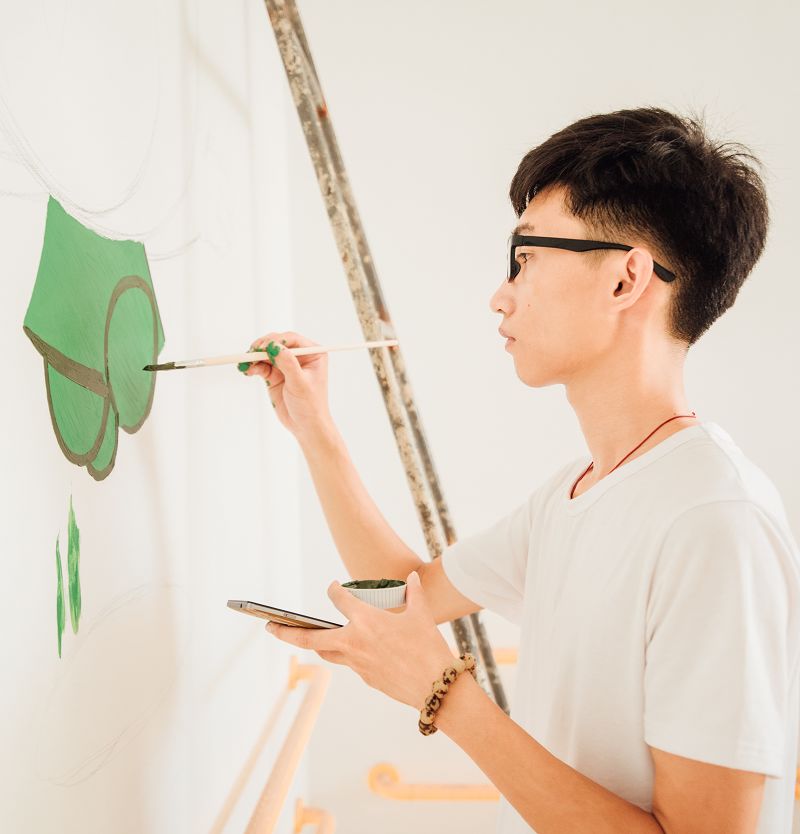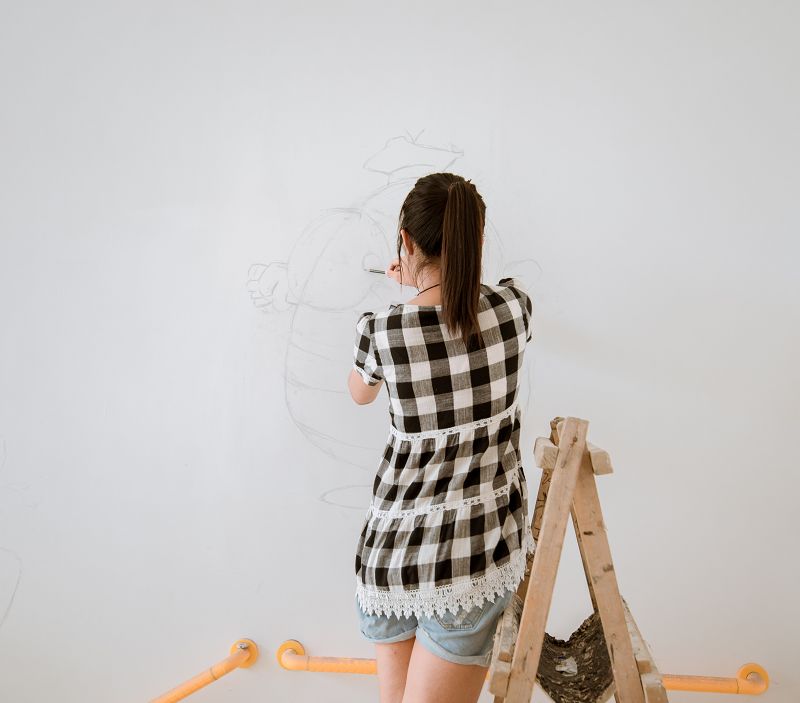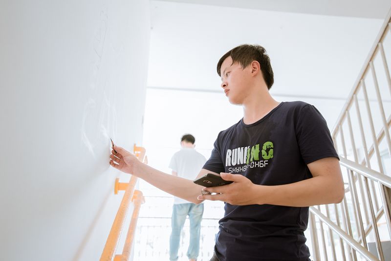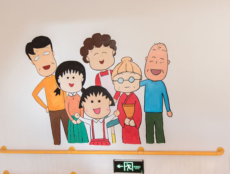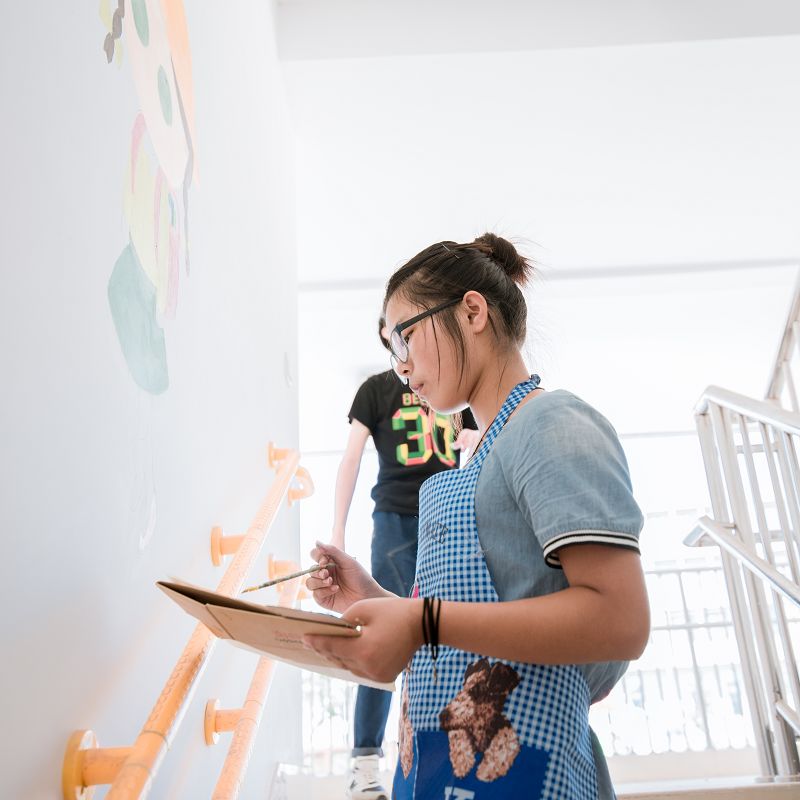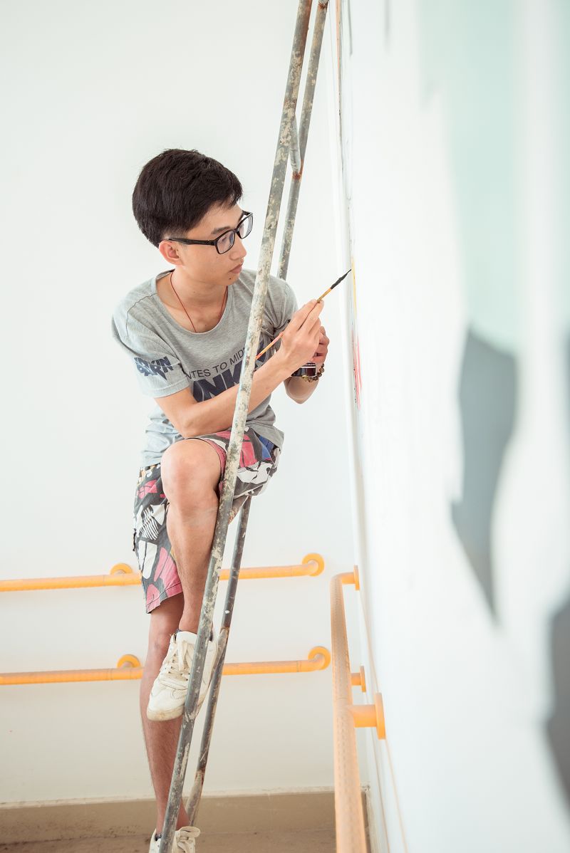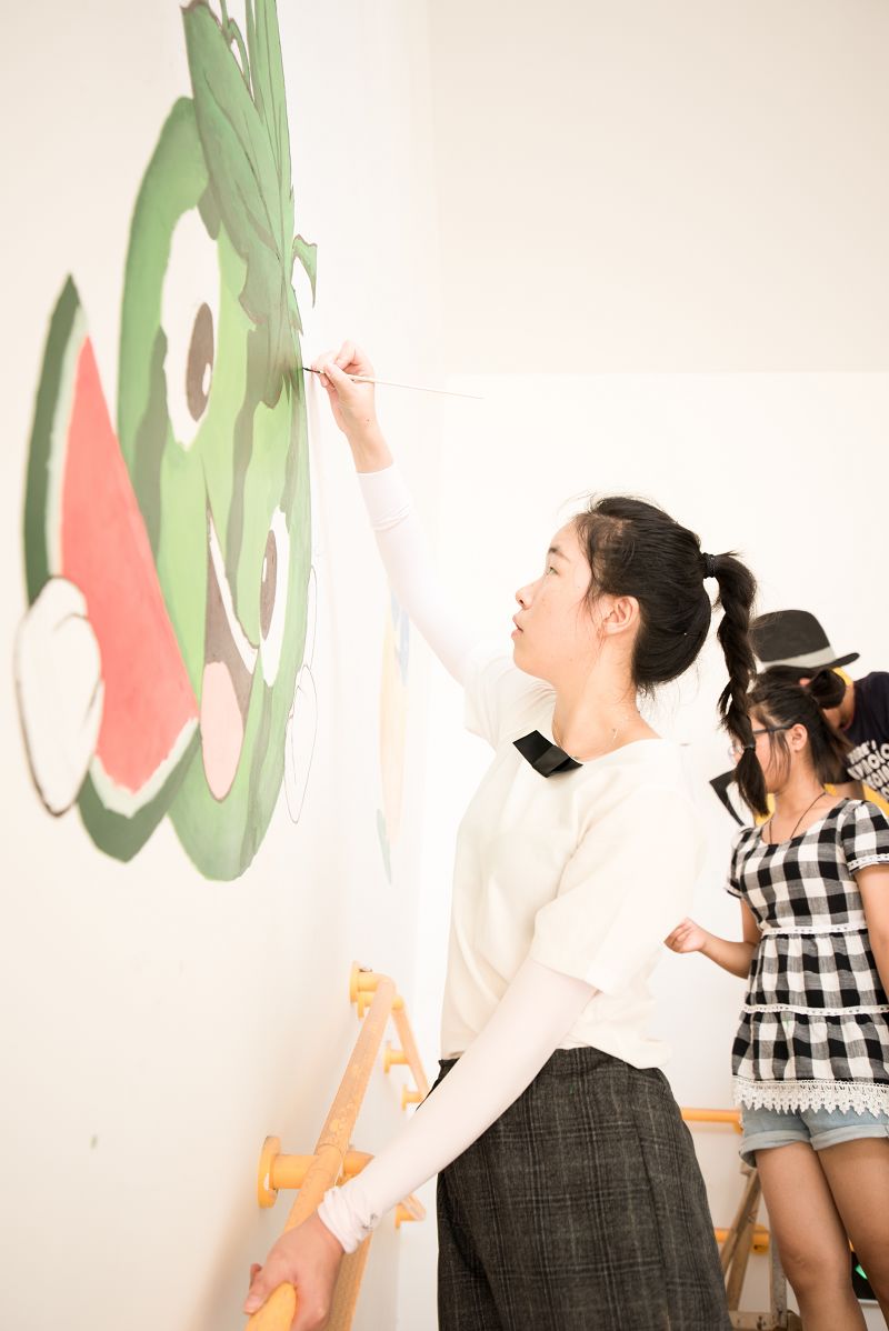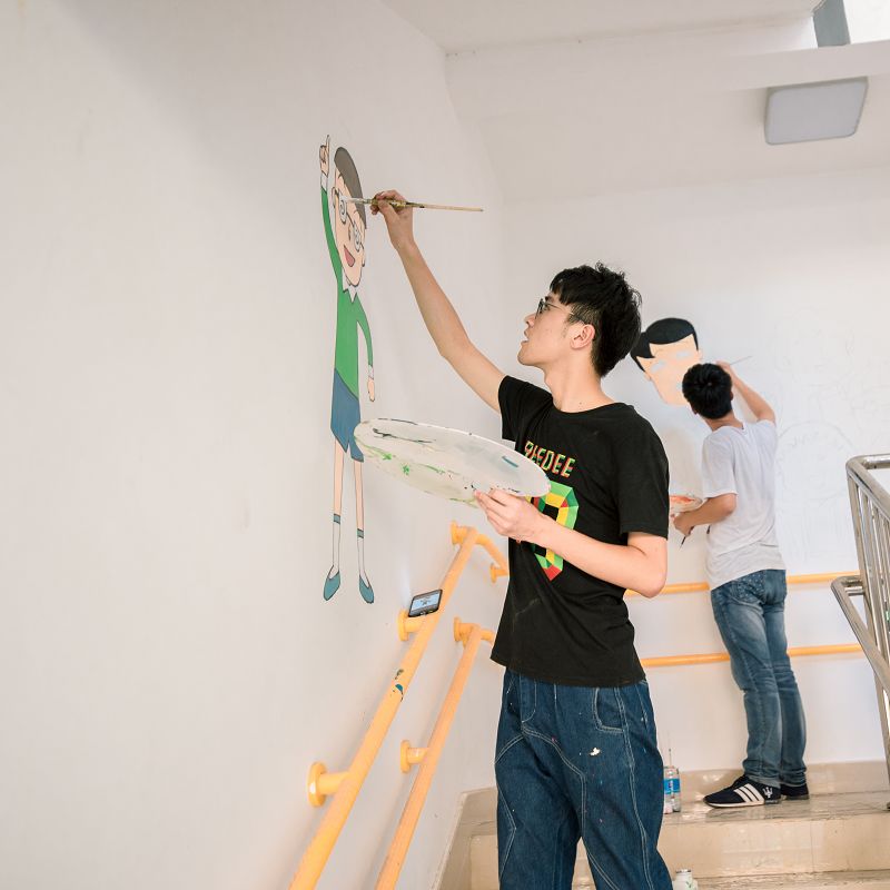 全体成员经之前的材料收集、绘画的准备、实地勘探、画稿准备等等,为这次福利院墙绘做足了准备。要完成在两栋楼、三层墙的十八面卡通人物的绘画工作,必须做到分工合作,目标明确。首先,同学们要打线稿,进行勾线绘画,然后进行颜色填涂。在涂色环节,由于用的材料是丙烯颜料,沾到衣服上不易清洗,因此,大家小心翼翼地上色。涂色时遵循冷暖搭配、对比色应用等原则,力求达到完整、美观的效果,给福利院的孩子带来彩色的家园环境。我们以儿童都喜闻乐见的卡通形象为基础,加之艺术设计的手法,让每层楼道的卡通人物都栩栩如生,让其更贴近社会福利院的环境氛围。至8月25日下午,墙绘任务结束之后,大家拖着疲惫的身子收起颜料,清理地面,把清洁的空间还给这清洁的福利院。