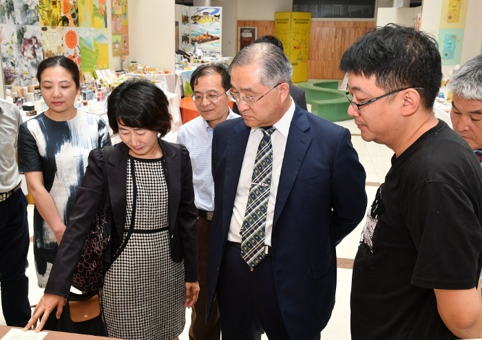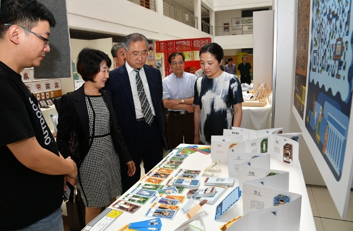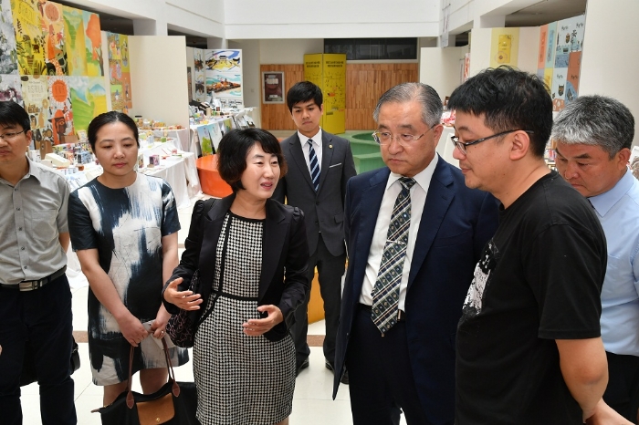 6月13日上午,韩国圆光大学金道宗董事长一行访问公司,在海外事务部、海外教育公司领导的陪同下,前来太阳集团tcy8722观赏了毕业生成果展,一行人员在艺术公司党政领导和视觉传达系主任尹毅老师的陪伴下,参观了近期举办的2016届毕业生设计作品创新成果展,尹毅老师很认真地向客人们介绍了员工的作品。