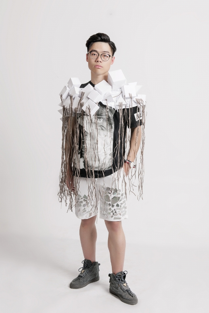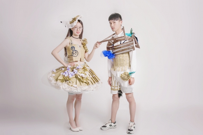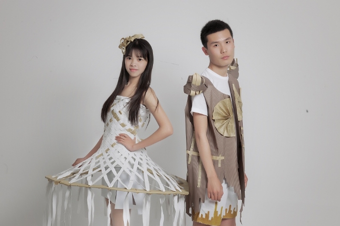 《红楼梦》中来自民间的丫鬟莺儿,学的一手线编的技巧。在古代这将这编结称作“络子”,女装身上的编结整齐划一,颇具美感,男装随性洒脱的黏着着褶皱瓦楞纸,两者风格统一,古风荡然。