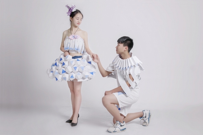 折纸本身的立体感和纸张的可塑性更增强了这种艺术感的塑造,纸张以其独特的材质将传统的布、丝、绸为主的服饰进行模仿的同时,也有其独特魅力,更值得把玩和欣赏。另一方面,纸艺以其简单的造型过程和强有力的艺术体现力,为服装设计师们提供了很好的服饰设计模型,可以帮助设计师用较小的成本设计出华丽、新颖的服饰,更加符合低碳和绿色发展理念上。让我们一起欣赏那精彩纷呈的员工“纸逸”春季创意服饰吧。