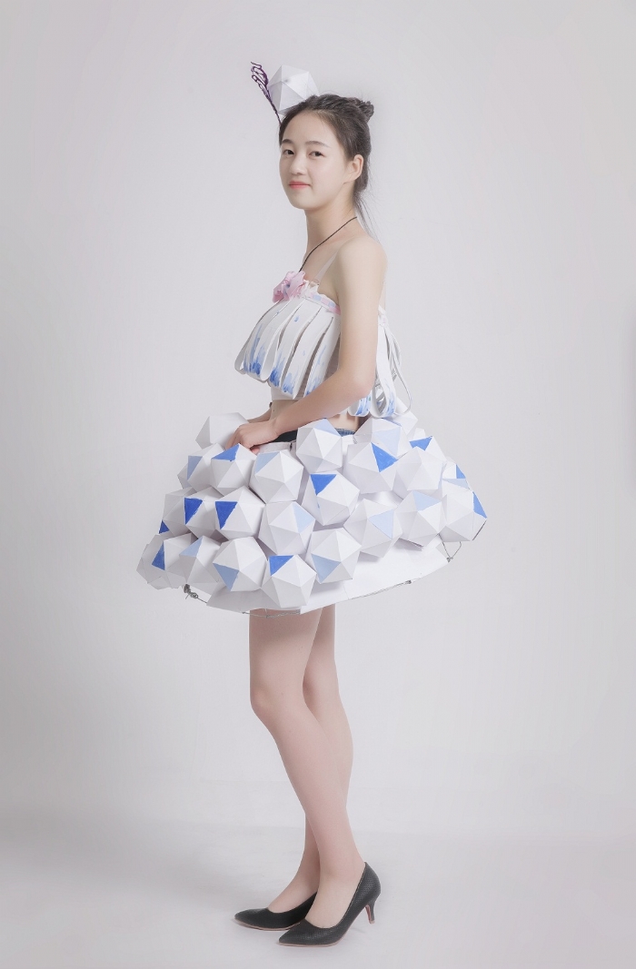 “吴刀剪彩缝舞衣,明妆丽服夺春晖”李太白在诗中赞美吴国裁缝刀剪技巧的高超,让人不禁联想到这一套服装,将纸张百变的姿态展现完美,同时将几何之美也融汇其中,不禁让人沉醉其中。