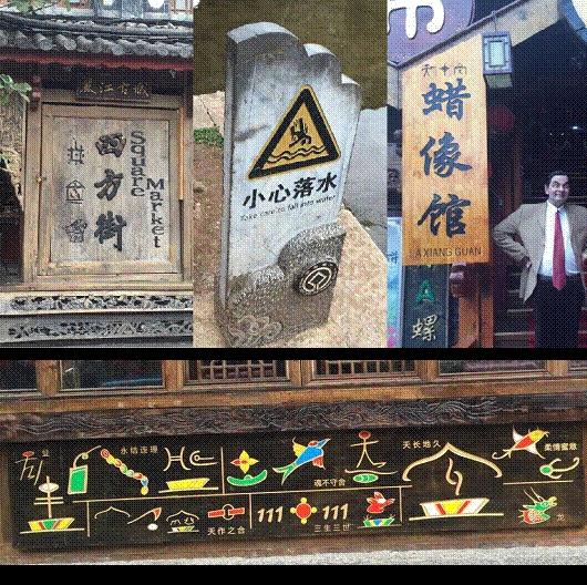 在丽江,我们见识了带有纳西象形文字的导向标识(图7),虽形式各异不成系统,但也不失为一种风格。我最感兴趣的是标示上的东巴象形文字,据说东巴文只有1400多单字,但词语丰富,既能写诗作文,表达细腻的情感,又能记录复杂的事件,是目前世界唯一存活着的象文字,被誉为文字的“活化石”。