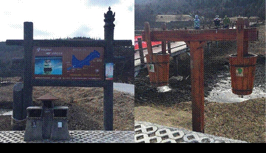 次日清早,我们经历了两个多小时车程来到普达措公园,调研这里的导向设计,普达措公园的导向设计带给我的整体印象是典雅造型、古木质地、实用性有机结合体,但系统性略显不足,其特点概括如下:(1)公园导向标识以景观引赏类居多,而警示限制性和管理性标示偏少。(2)公园充分利用景区内的河流、地势起伏,配合藏地特色的木制建筑、民器符号造景等来引导游客,尽可能地减少合成材料标示对景观的破坏。如图所示的水桶和建筑柱梁造型本身既是景观,又具有引导作用,此外道路上不时出现的木制路线牌和标高牌为那些登高的游客记录着步步向上的喜悦。(3)偶有一些巧妙的多功能设计,但未能贯穿全局,如图的水桶造型,既是垃圾桶,也是导向牌。(4)有些标识设计缺乏对受众视线和角度的分析,字体字号效果较差,也缺乏统一性。(4)一些标识存在位置设置不当的问题,不易被发现,也就失去了标识存在的意义。总体上看,普达措公园的导向设计虽存在一些不完善之处,但仍体现了因地制宜,节约成本,融合当地文化风情的设计意图,增加人们的亲切感,又与自然相辉映。