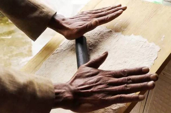 在热闹的束河古镇,我们进到一家书有“东巴纸店”招牌的小店,老板白让措嘉得知我们来自江苏,便热情地向我们介绍东巴纸,东巴纸由唐朝时丽江纳西少数民族创制,距今已有一千二百多年历史。白让措嘉见我们兴趣盎然,便说你们真幸运,正好这几天我们在造纸,感兴趣的话带你们去后场看看制作过程,随老板来到后场,我们在这里看到了造纸的主要材料,一种当地独有植物“阿当达”,实际是一种瑞香科植物丽江荛花,造纸的过程分采集原料、晒干、浸泡、蒸煮、洗涤、舂料、再舂料、浇纸、贴纸(图8)、晒纸、压纸(图9)、揭纸几个步骤,而今天我们的确幸运,恰好看到了最后一步揭纸的过程,只见一名工人正在将一块贴满纸浆,即将晒干的晒纸帘轻轻取下,然后用压纸棒用力将纸面碾压平整,继续置于阳光下晾晒,然后迅速跑到另一张已晒干的纸前用手轻轻一揭,将纸揭下,便得到了一张古色古香的东巴纸。当我们问到这样一张纸的价格时,白让措嘉笑而不语,这更让本来就神秘的东巴纸变得魔幻起来了。