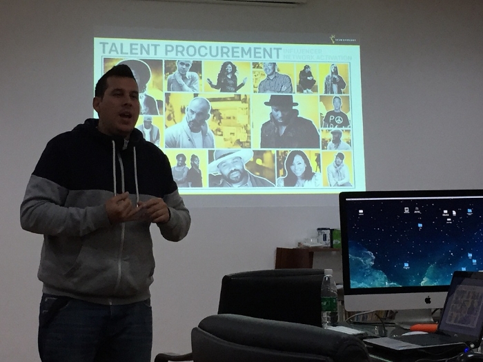 Steven重点就自己设计的Heineken和Pepsi旗下的一款饮料子品牌做了讲解。从接受任务、踏勘现场、效果图表现,到施工图绘制再到最后实施效果,一一作了讲解。Steven结合自己的项目讲解设计中如何创造性地运用“Five Senses”。例如:设计Hennessy营销活动时将展厅设计成酒瓶的样子,客户犹如坐在酒瓶中一般;在设计Pepsi旗下一款饮料体验活动时,将蜥蜴图样的logo创造性地应用于衍生品开发,饮料吸管是卷曲的蜥蜴尾巴造型,浴巾上印有一对蜥蜴爪子图案;将某品牌的推广活动选择在纽约码头一个废弃仓库里,让来宾体验“黑帮大佬”的感觉等等。