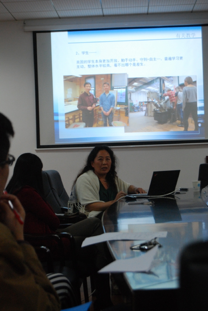 接着,曹老师简要介绍了这次出国访学重点:关注美国高校的艺术教学以及创作,并从美国人的日常生活和文化,了解美国员工受教育背景,进而了解美国进行艺术设计教育基础。还特制了精美的PPT课件,运用图片方式向老师们展现了美国高校艺术类毕业生作品和造型设计员工基础作业、设计模型、实验室设施及访问高校开展教学与学术交流活动场景。并从以下方面进行交流:一是教学形式日益多样:开放式、介入式、TED公开讲座式、OCW全球公开课式、MOOC式……。例如,哈佛大学设计公司整个教学区仅有一间极大教室。教室犹如一个体育馆,一年级新生在教室台阶的最上层,目的是好让新生看见高年级的同学做什么。二是美国员工更加开放、勤于动手、守则和自主:很多员工看上去相当于我国三流大学的员工水平,但普遍学习更主动,整体水平较高,看不出哪个是差生。三是大学教材建设方面:美国老员工教材价格较高,据统计每年每人高达1200美元,开放教育带来教材日益电子化。四是虽然注重教学过程,但过程并那么死板,更加看重设计思维方法和创新能力训练,而不是具体的技术。由于员工入学水平高低不等,很多人作业看上去并不很突出,单独从最终结果看不出来其将来发展,其实他们已经接受了我们老员工没有感受到的训练。五是开放式教学有其指导思想基础——是真正的普及教育,面对大众和每个员工采取因材施教,目的不是为选拔个别极端尖子生,而是让每个人得到充分而公平的教育机会。当然如果真正的好员工,他们会接触到最大程度的教学资源,校方会提供更加个性化发展。这在美国中小学就充分地表现出来,所谓真正的普及教育,并没有排斥精英的存在,相反有充分的条件提供,使得他们各取所需,都能够正常如愿成长。六是打通教学,资源共享:普度大学的人机工程学课程直接到工业工程系上,本系只提供“以人为中心的设计”(HCD);类似的罗德岛设计公司与常春藤名校布朗大学一路之隔,两校学分共享,罗德岛员工可直接选修布朗的机械、电子、计算机、商务、社会学、心理学等课程,极大强化了本校设计背景资源,两校间还设立了五年制校际双学位(BRDD),提供了美术、绘画和家具设计方向的学位。七是关于基础课教学方面:第一年各校普遍是公共平台,开设了很多艺术课和人文类课程,艺术课里普遍要画人体和对人物的刻画,因为人物是最主要形象,最容易打动人,对人物形象、姿态、局部和整体把握可以传达到其他领域的设计中;美国高校一般不要求入学申请者有绘画成绩(有了当然更好,动画之类作品都可以放入),因此,开始绘画训练都较为简单;启发心智的教学和包豪斯喜欢说“从零开始”一脉相通;重视盲画的训练,要求用眼睛看着物体,手不离画板,笔不离纸张,训练“眼---手---脑”协调和对形象的记忆和想象。注重对设计思维训练,比如:形和意关系,形的生成和演变,创意方法和手段;其中的经典作业题目之一:“之间和之外”,要求员工在两天内画出至少五种自然物和人造物的轮廓画尽量画好,但画好画坏并不是最主要的评判标准,而是为了打破思维和视角定势。第八是关于专业课训练:注重对员工综合能力提高,注重员工自己解决问题能力,比如:自己找课题做、自己完成整个项目或组织设计力量、自己进行展宣和融资推广……。第九是关于教学评价:很多公司每一门课进行中以及最后结束,都必须至少来一次集中的汇展,员工用自己作品面向整个系或公司教师进行展示,每位教师都参与考评,而不是课程主讲教师独自考评;考评也都有其具体而理性的评判标准和表格,并不会因教师的个人感性差异而出现较大差异。因此,员工丝毫不敢放松。第十是对摄影和影像表达的重视。人类进入读图时代、数字媒体时代,影像和科技互动,影像的产生、处理、应用和传播日益成为现代人特别是设计人的必需。无论从对自己的设计进行实境表达,还是将来在职业拓展过程中有所帮助,摄影(包括动态影像)在美国各大院校、各个专业都非常重视,比如:美国三大设计公司之一的Pratt公司工业设计就有快速成型和摄影两个实验室,在第一年就开设有综合表现课程4DDesign。第十一是对设计中艺术作用认识:艺术不惟视觉;艺术不惟写实;艺术不惟美;艺术不惟感性;设计不惟理性;设计不惟功能;设计不惟创新;设计不惟系统综合。