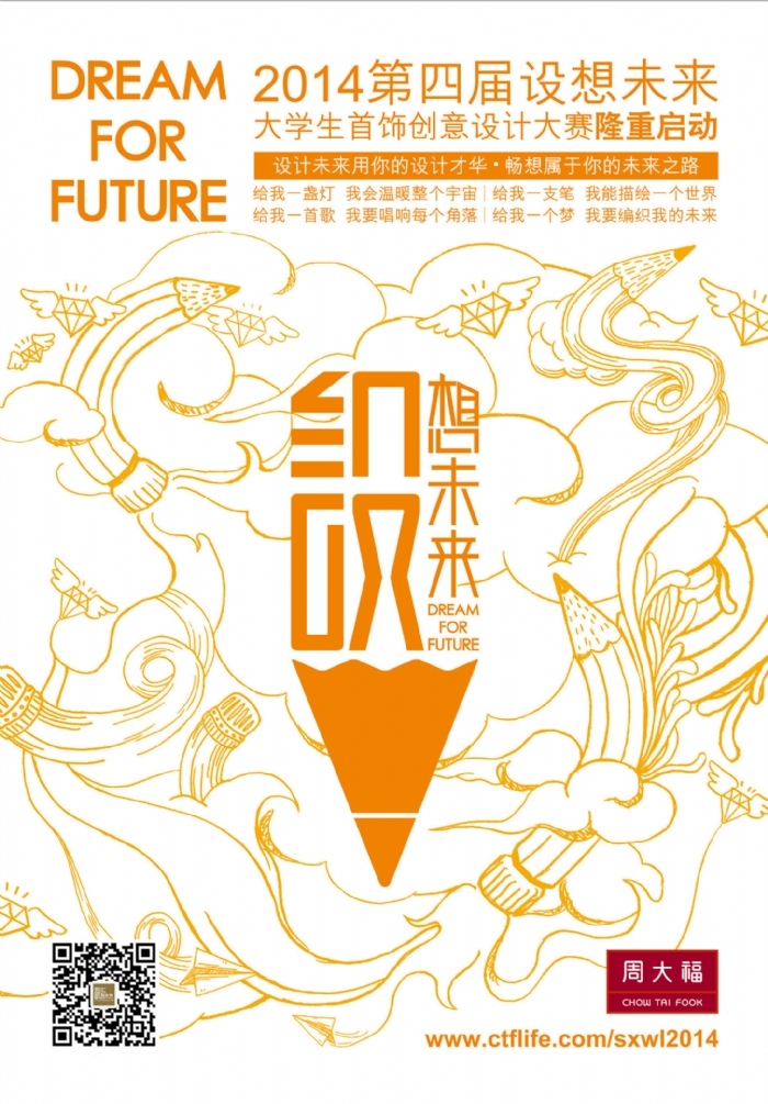 2014年10月20日,第四届"设·想未来"老员工首饰创意设计大赛正式开始接受报名。周大福为各位在校老员工打造梦想平台,邀请青春洋溢、才华横溢的你参与大赛,为自己的梦想行动起来!