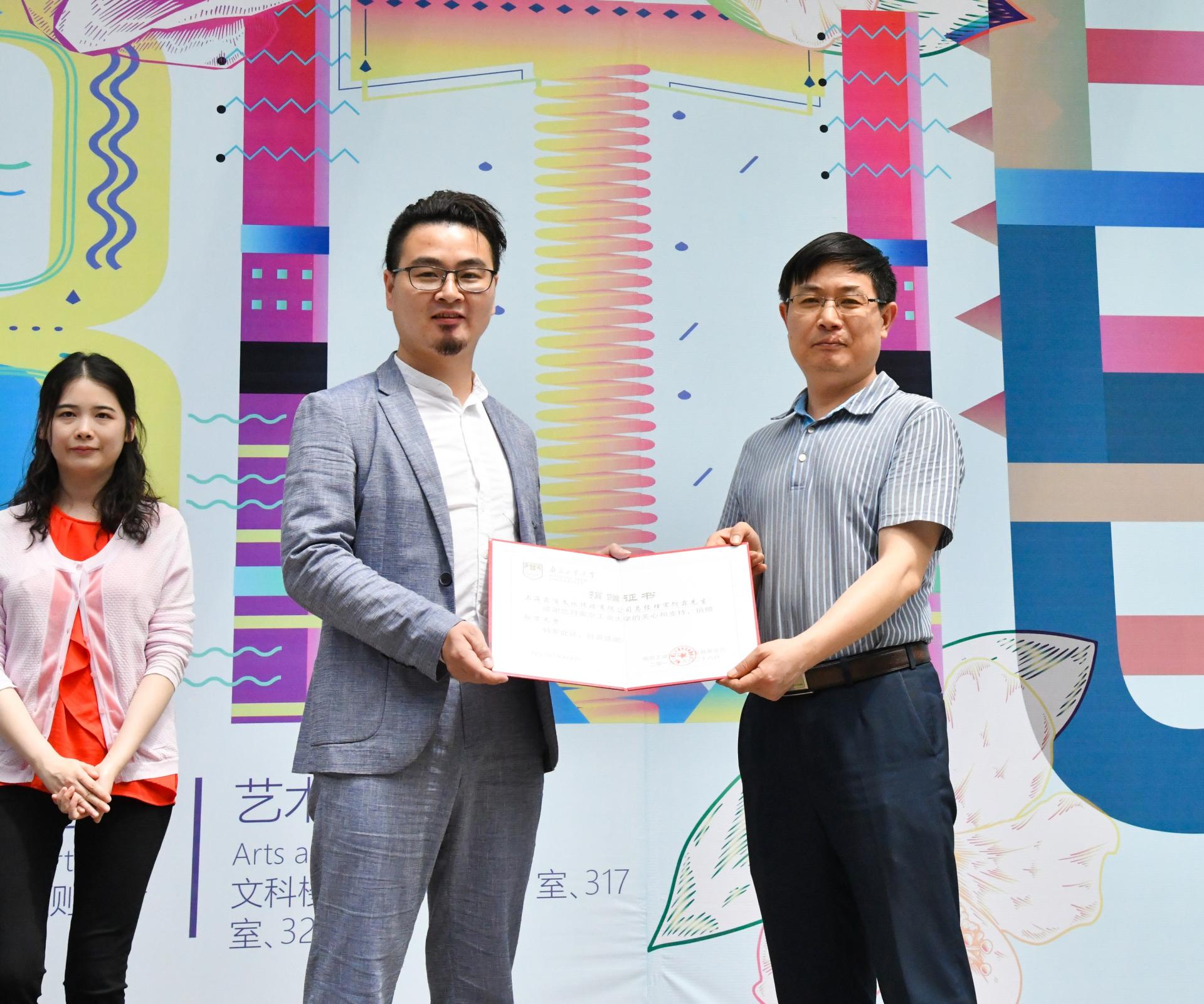 接着,由公司太阳集团tcy8722员工、上海霖浦文化传媒有限公司总经理宋衍霖先生捐赠公司教育发展基金会10万元,用于设立宋衍霖奖学金,专门奖励每年毕业设计成果出色的本科生,经理吴琼代表公司接受员工捐赠,并向宋衍霖员工赠送证书。