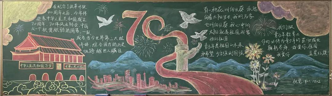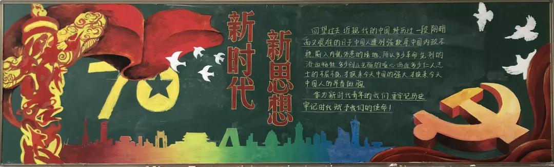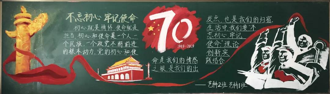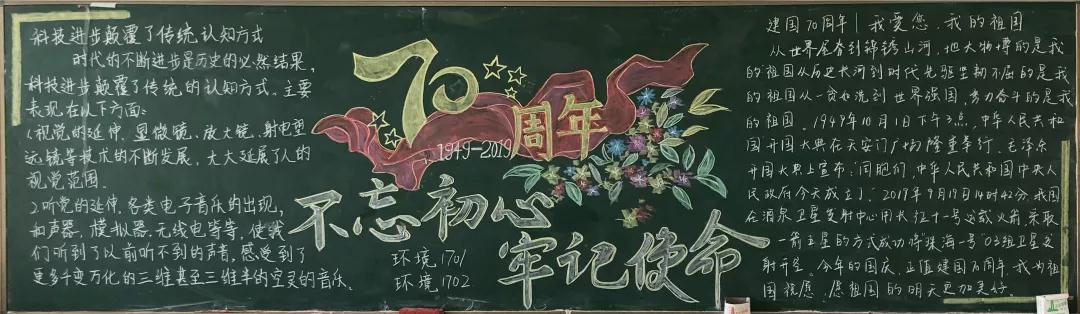 在这次绘制活动中,各班级同学们怀揣着一颗炽热的爱国心,认真准备,把对祖国的热爱定格在丰富多彩的黑板报上。初心就是情怀,使命就是担当,初心和使命是一个人、一个民族、一个国家不断前进的动力与方向。作为新时代新青年,要牢记初心、牢记历史、牢记时代赋予我们的使命!