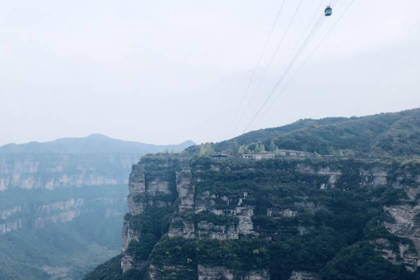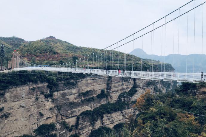 中午,写生基地老板将午餐给带到了山上。饭后稍作调整,我们坐车直达玻璃吊桥。桥面长280米,横跨两山之间,桥面全部采用透明玻璃铺设。走在桥上,仿佛空中漫步,激动和喜悦冲淡了对高空的恐惧,瞬间洗涤你的心灵!头上蓝天白云,脚下绿树青山,环顾四周,又能将太行大峡谷周围的风景尽收眼底,群峰峥嵘,如一幅千里江山画卷,细说着祖国河山的壮美。