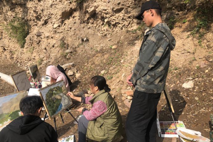 我们画画时,曹老师和翁老师会在一旁辅导和改画。因为我们每个小组选的地点不太一样,老师不得不来回奔波。好在同学们都很认真地向老师学习,也不算枉费两位老师的一片苦心。