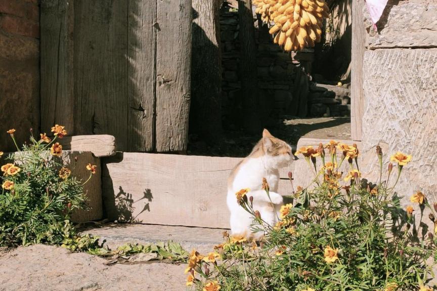 中午日头高起,明媚、温暖将山间的清冷和潮湿都送回山林之中,雾气也已消散。太阳仿佛将整个峡谷都唤醒了,日光、人语、鸟音、虫鸣......慢慢地将整个村子变得温馨、热闹了起来。我们以组为单位分散在村子里画画,时不时地,会有一些可爱的小动物依偎在我们身边,还有站在身边看我们画画的小孩子。我想,生活明朗、万物可爱大概就是这样吧。
